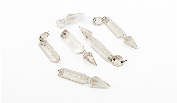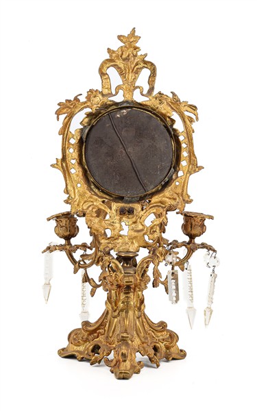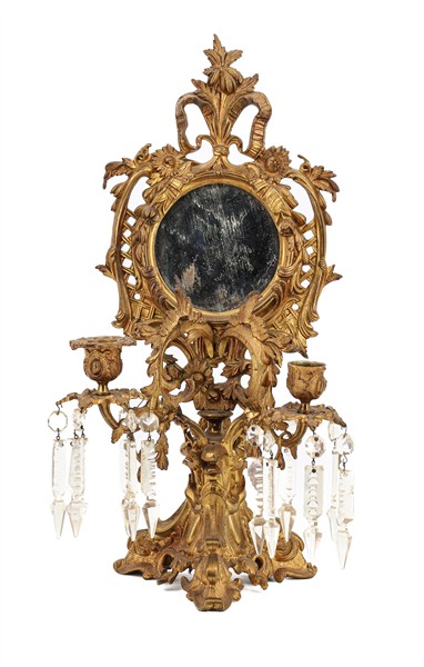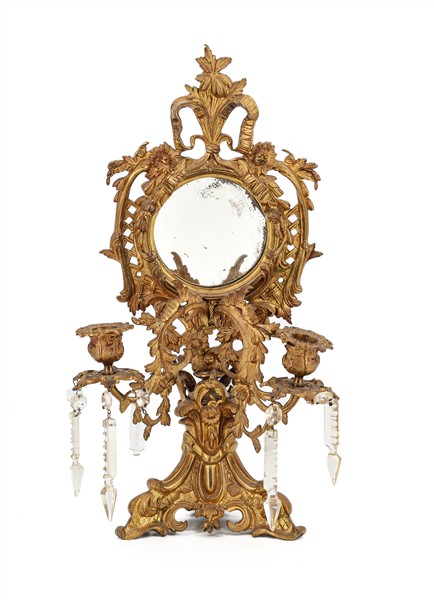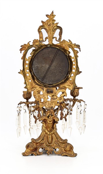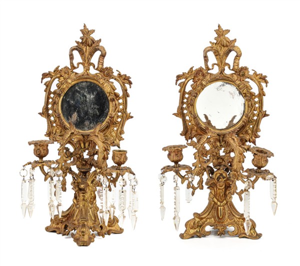 Coppia di candelabri in metallo dorato con sostegno tripode e doppio braccio portacandela, sormontate da specchio circolare in cornice traforata e pendenti in vetro sfaccettato. Inizio secolo XX (h cm 43) (difetti e mancanze)