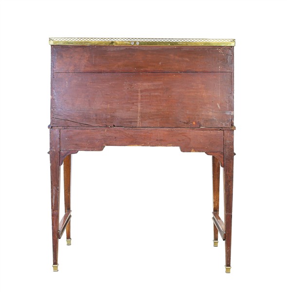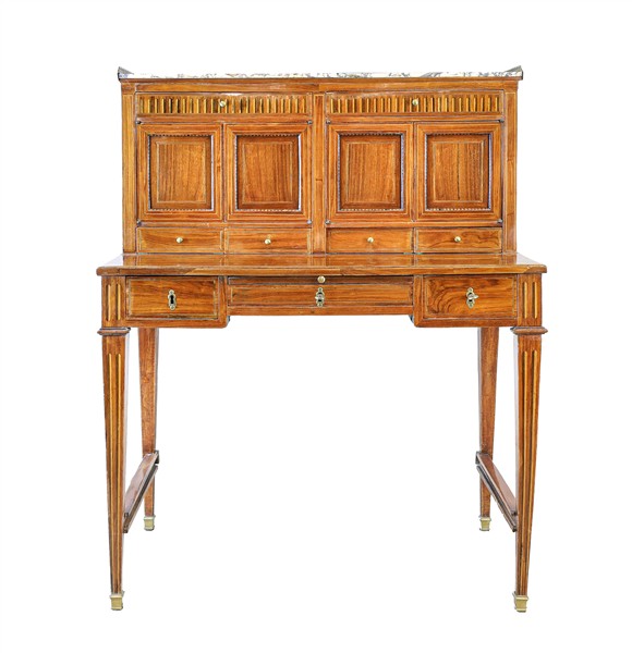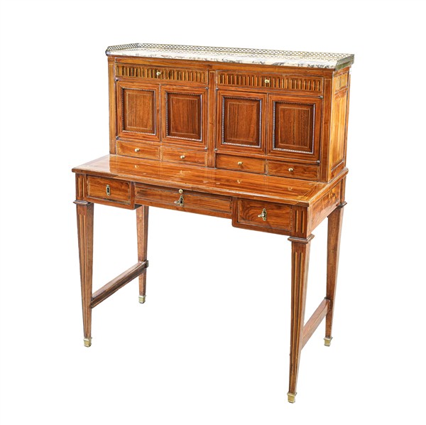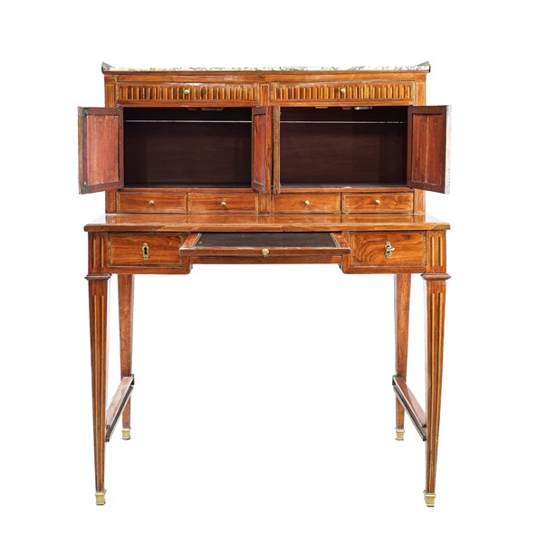 Bonheur du jour lastronato in mogano e filettato in legni di varie essenze, fronte a tre diversi cassetti e tablette sottopiano, gambe rastremate raccordate da traversa, parte superiore a quattro antine pannellate con chiusura a molla segreta, sei diversi tiretti e piano incassato in breccia, ringhierina e piedi in metallo dorato. Francia, secolo XVIII-XIX (cm 92x116x49) (difetti e mancanza)
