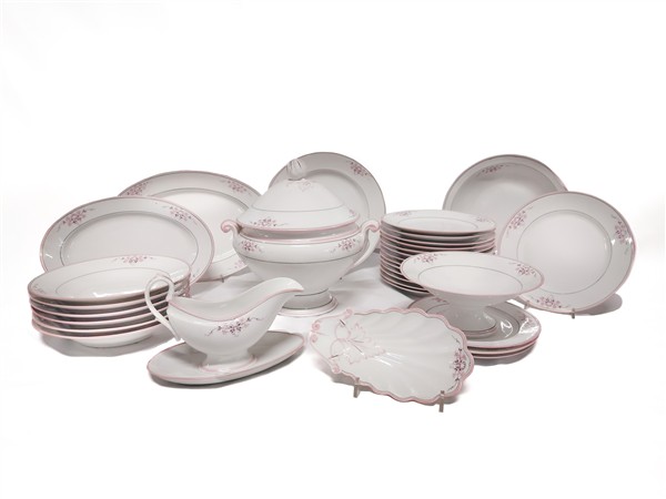 Manifattura Richard, secolo XIX. Parte di servizio da tavola in porcellana con filettatura rosa e decori floreali composto da: quattordici piatti piani e sei fondi, tre piatti da frutta, due piatti da portata ovali e uno tondo, una raviera a forma di conchiglia, insalatiera, zuppiera, salsiera e un'alzatina. (difetti)