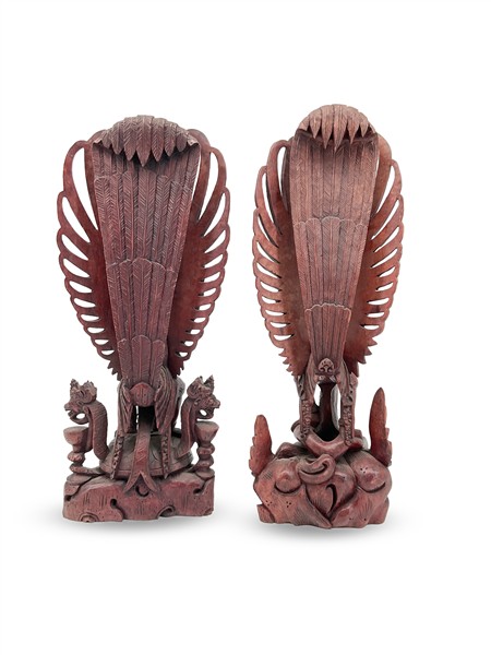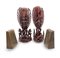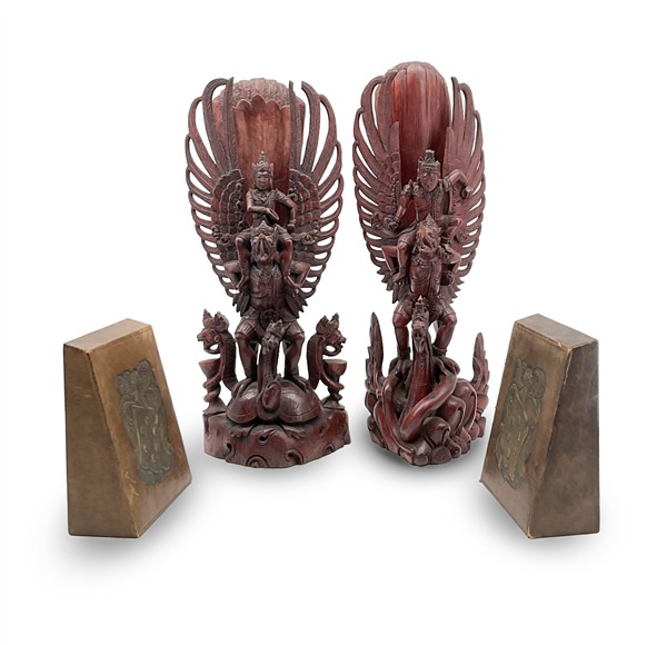 Lotto composto da due fermalibri rivestiti in pelle impressa con stemmi cavallereschi (h cm 16) e coppia di sculture lignee balinesi di divinità (h cm 41) (difetti)