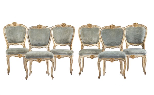 Gruppo di sei sedie in legno intagliato, dipinto e dorato, schienale sormontato da cartella con rosa a rilievo tra girali, fascia centrata da mascherone, gambe mosse terminanti a ricciolo. Secolo XIX (restauri e rotture)