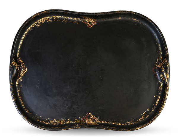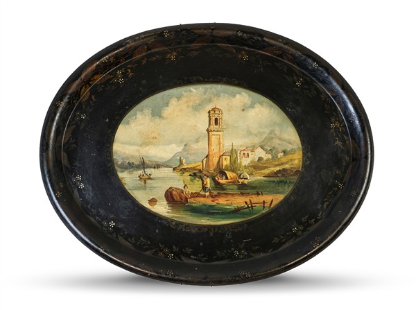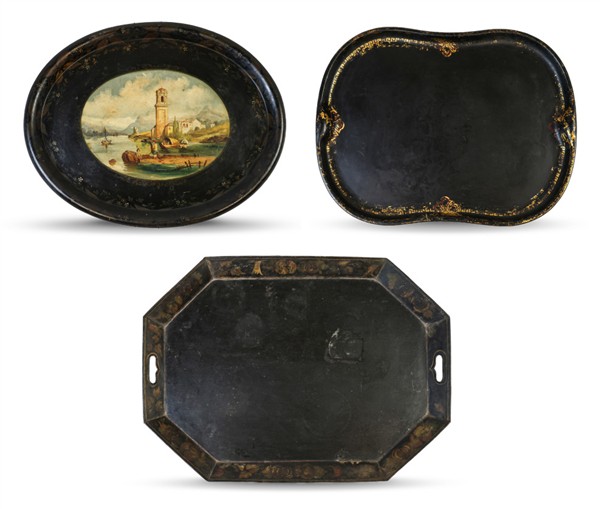 Lotto composto da tre diversi vassoi in tole-peinte di cui uno di forma ovale dipinto in policromia con paesaggio lacustre, uno sagomato e uno ottagonale a fondo nero. Secolo XIX-XX (cm max 73x58) (difetti)