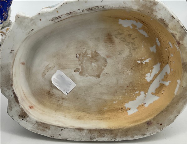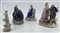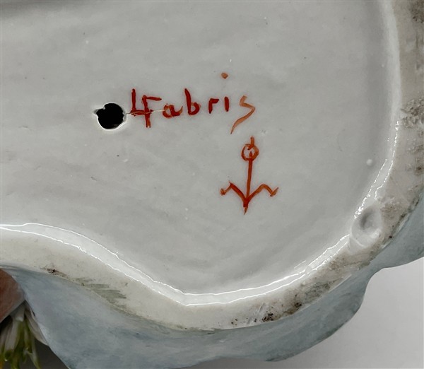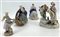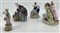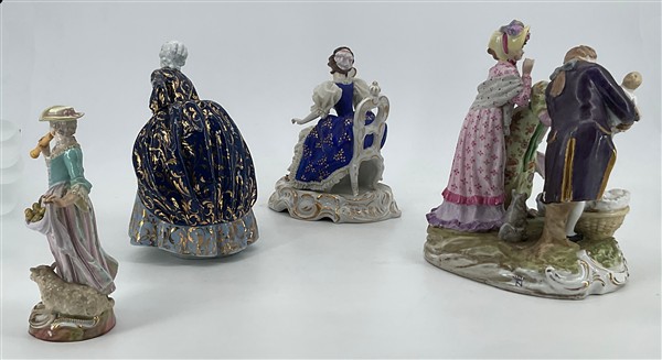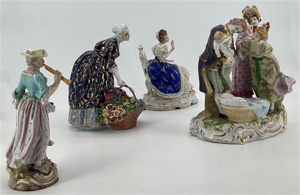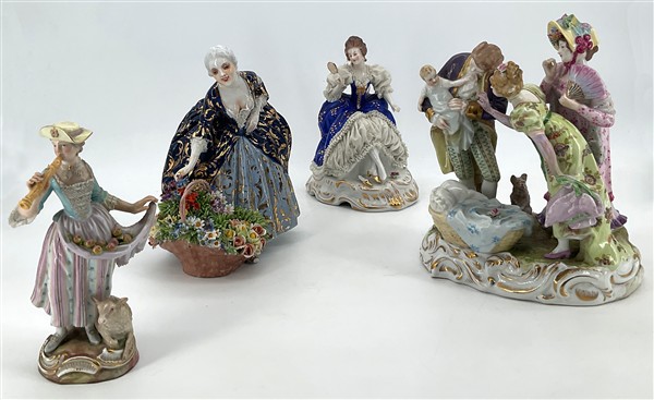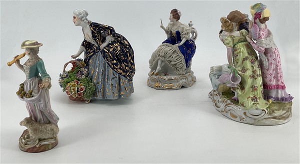 Manifatture differenti, secolo XIX-XX. Lotto composto da quattro diversi gruppi in porcellana policroma tra cui una figuretta con pecorella (Meissen) e una dama con cesto di fiori (Fabris) (h max cm 21) (difetti, restauri e piccole mancanze)