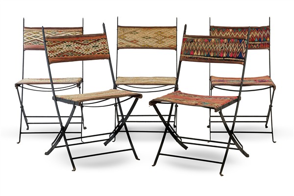 Gruppo di cinque sedie pieghevoli in ferro battuto con sedute e schienali confezionati con frammenti di Kilim del Marocco del secolo XX (cm 46x88x53) (difetti)