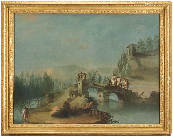 "Veduta con ponte e viandanti"