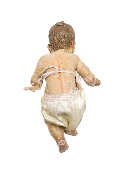 Arte dell'Italia meridionale, secolo XIX. Presepe in papier-machè e legno policromo con profili dorati composto da figure di Maria, Giuseppe e il Bambino, occhi in pasta vitrea (h. max cm 29) (difetti e mancanze)