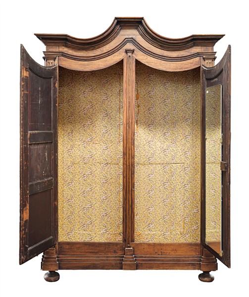 Armadio in legni vari a due ante sagomate con antiche pannellature intagliate a motivi stilizzati, cappello a volute contrapposte (cm 160x240x61) (difetti e restauri)