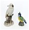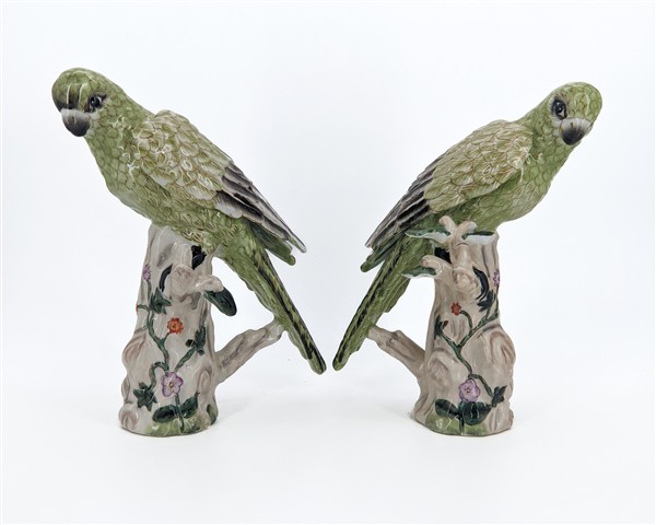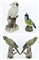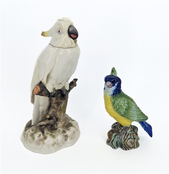 Manifatture diverse, secolo XX. Lotto composto da quattro diverse figure di pappagallo in porcellana e maiolica policroma tra cui una a contenitore (h max cm 27) (difetti, mancanze e restauri)