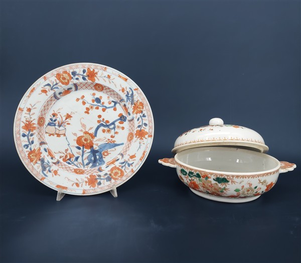 Lotto composto da una equelle biansata con coperchio in porcellana decorata a fiori con profili in oro, Compagnia delle Indie (l cm 23) e un piatto con decoro Imari policromo. Cina secolo XVIII (d cm 23) (difetti)