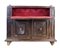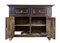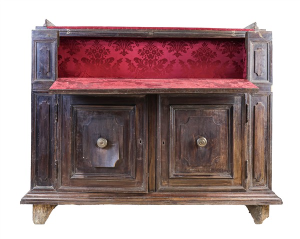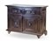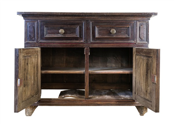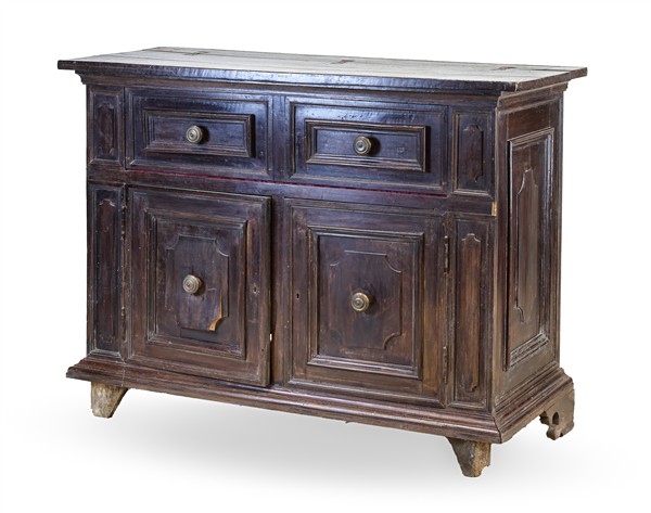 Credenza in legni vari con fronte a due sportelli pannellati, piano e finti cas
