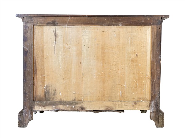 Credenza in legni vari con fronte a due sportelli pannellati, piano e finti cassetti ribaltabili (cm 134x102x57) (gravi difetti)