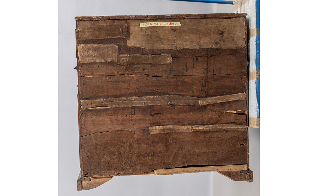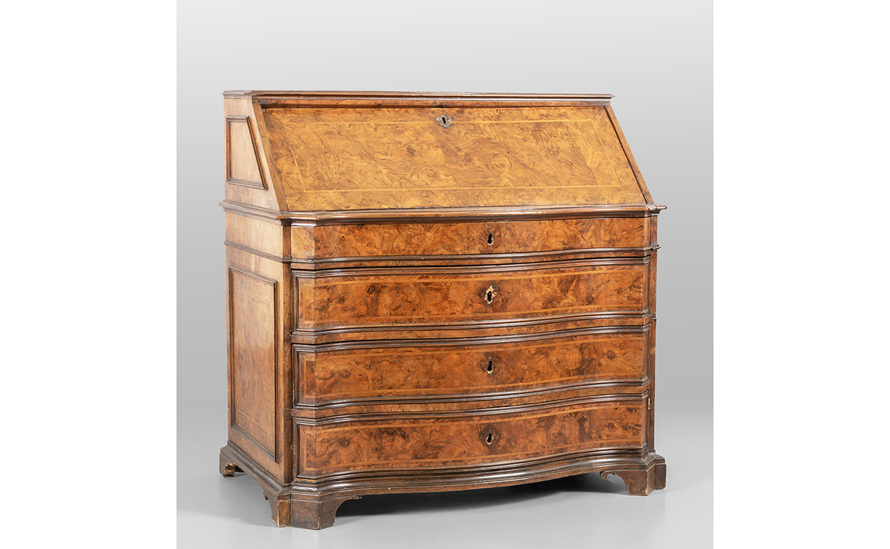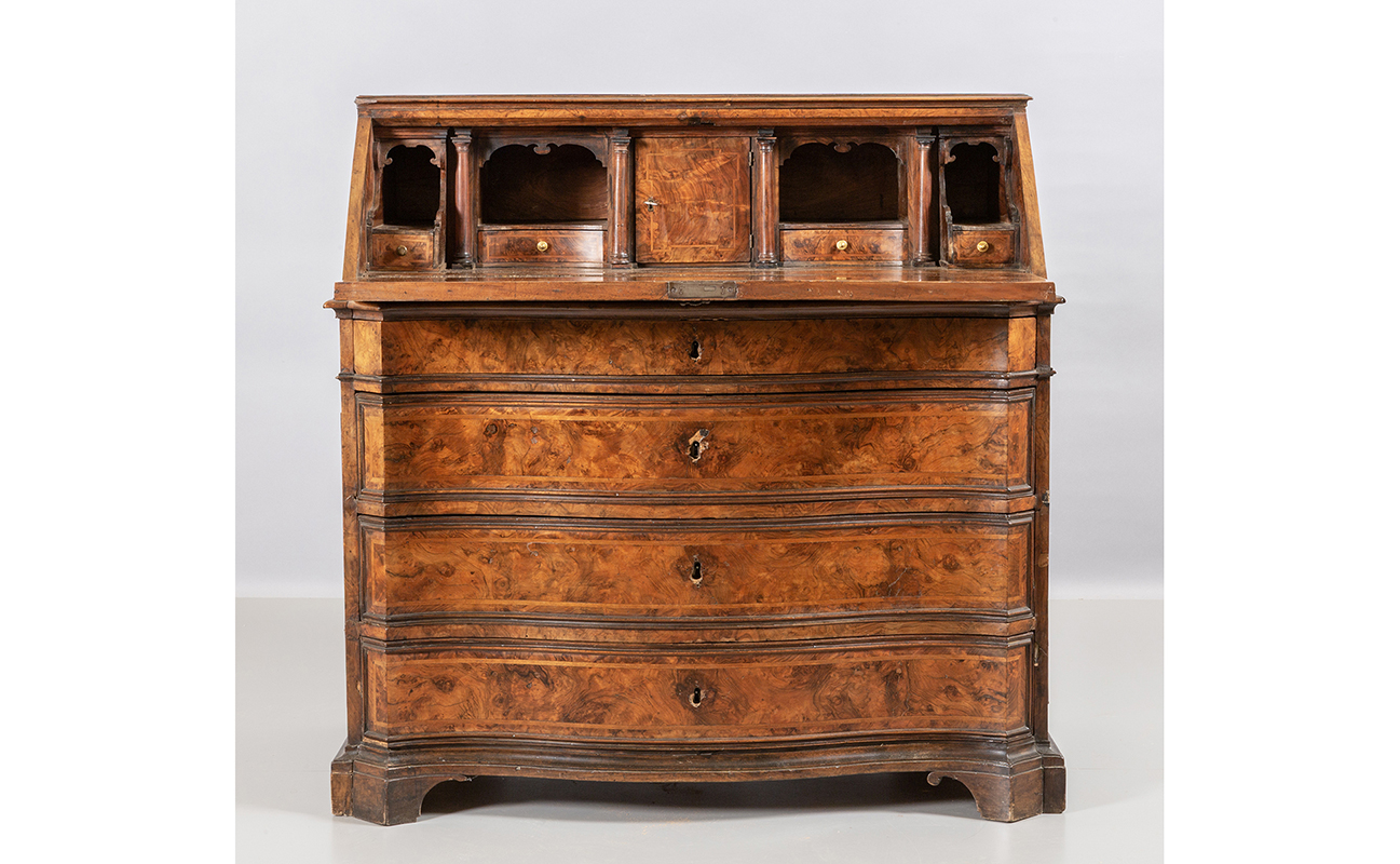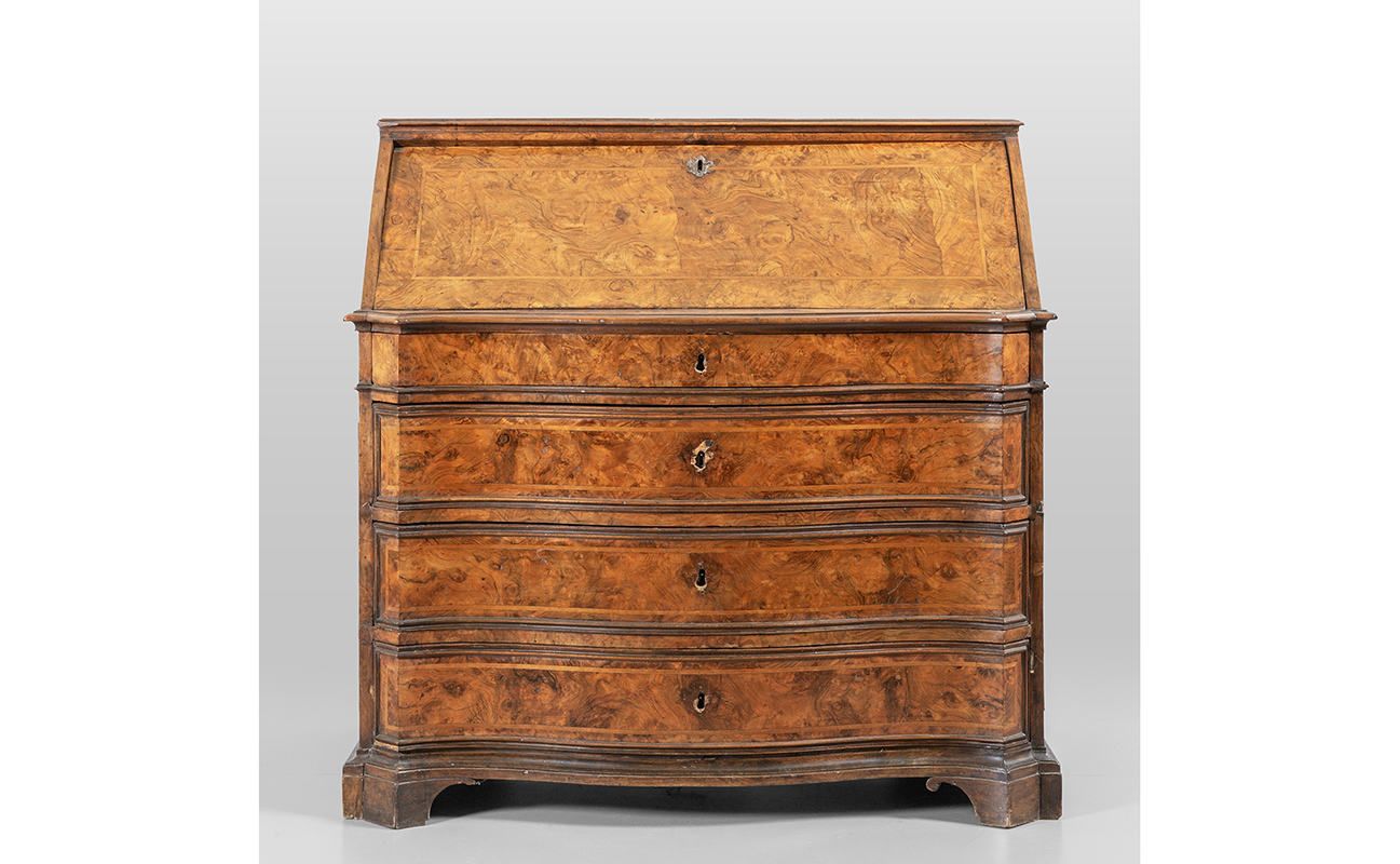 Ribalta Luigi XIV a tre cassetti più uno lastronata in radica di tuja Roma sec.XVIII