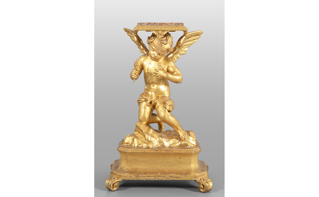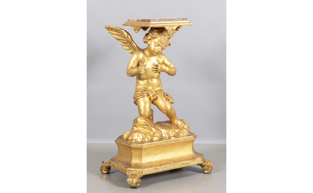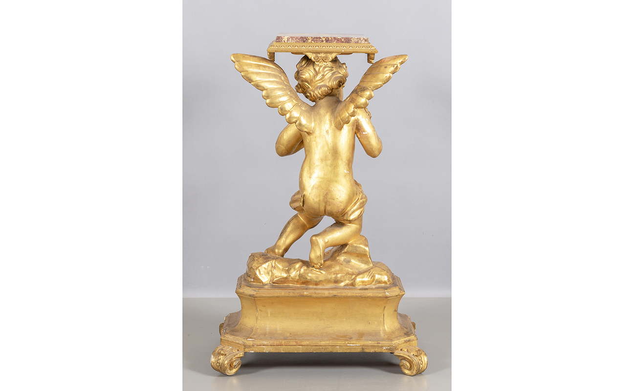 Mensola in legno intagliato e dorato raffigurante un angelo che sorregge un piano in broccatello di Spagna sec.XIX