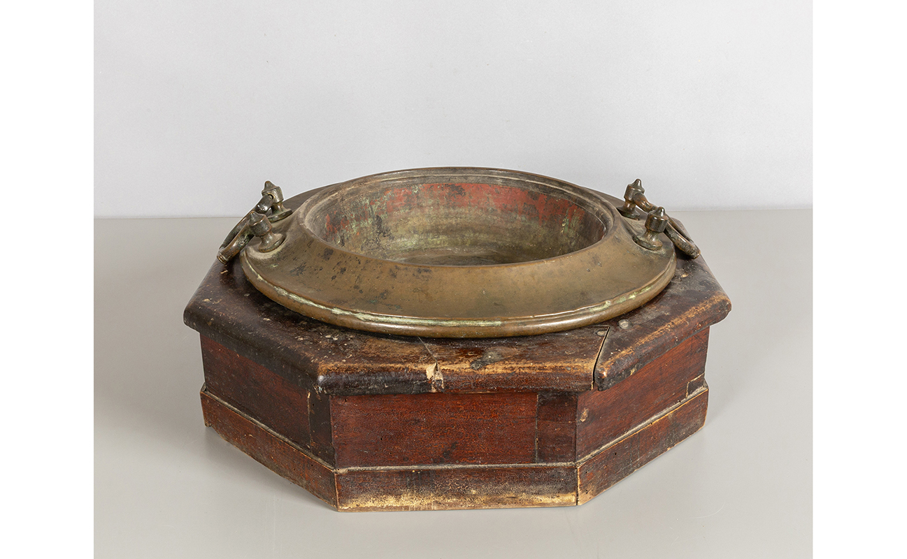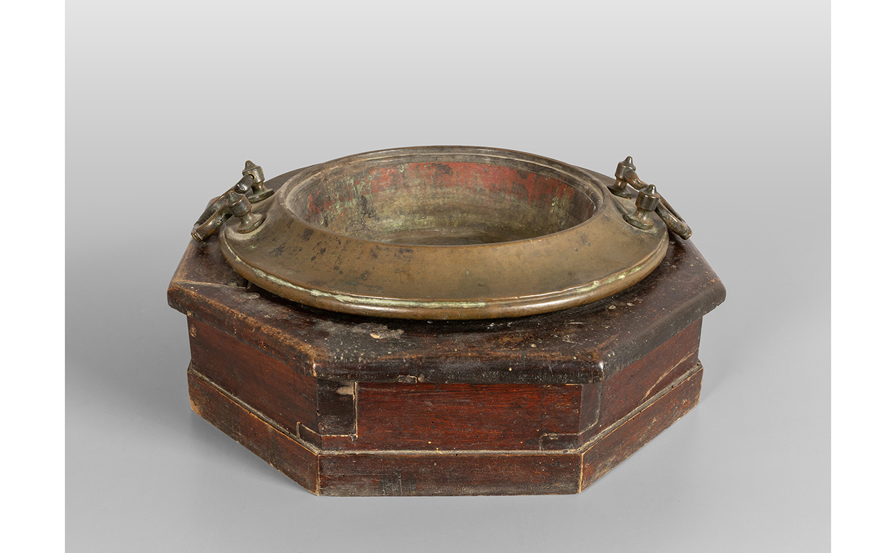 Bracere in bronzo con manici supporto in legno coevo sec.XVII