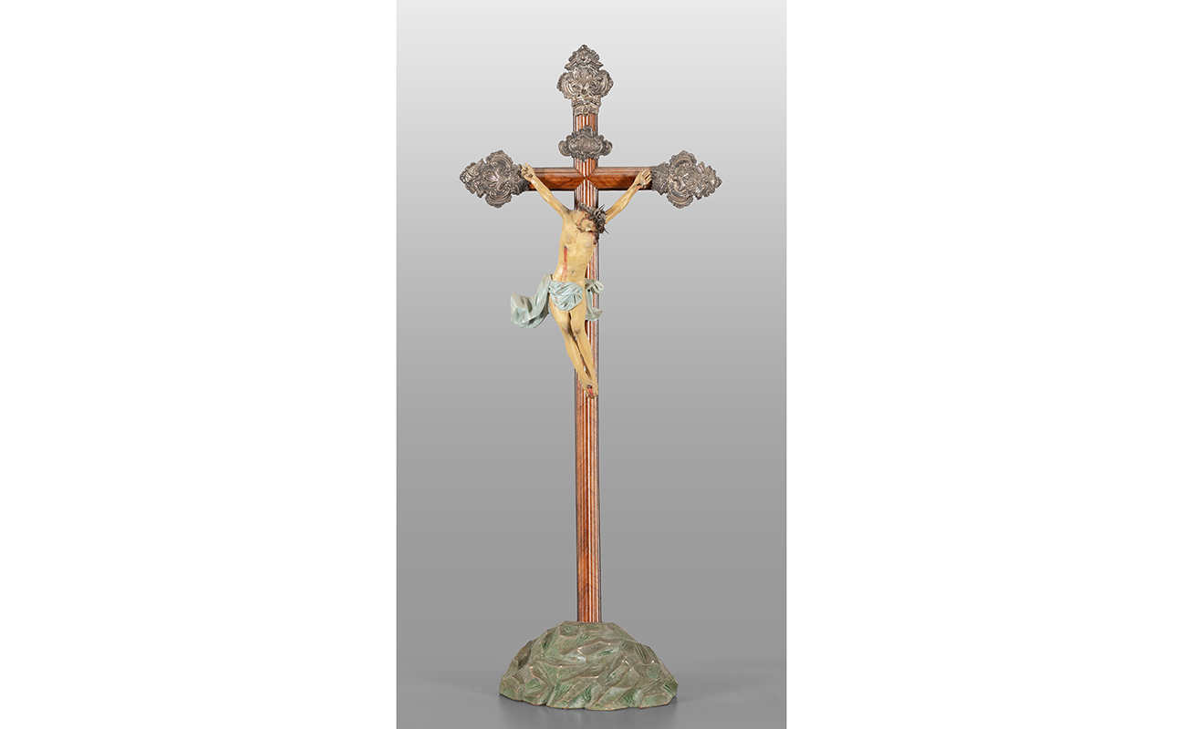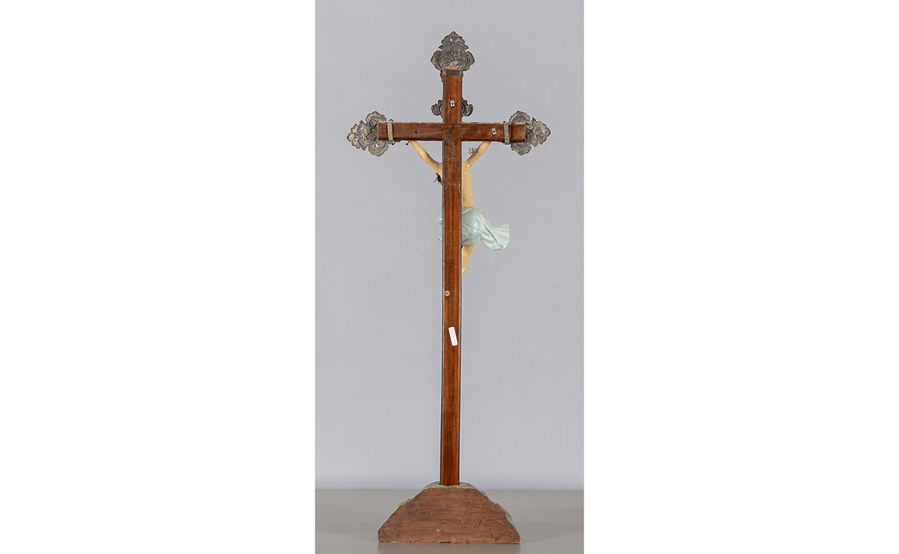 Scuola genovese sec.XVIII 'Cristo' scultura in legno intagliato e laccato Croce lastronata in legno di rosa con canti in argento sbalzato