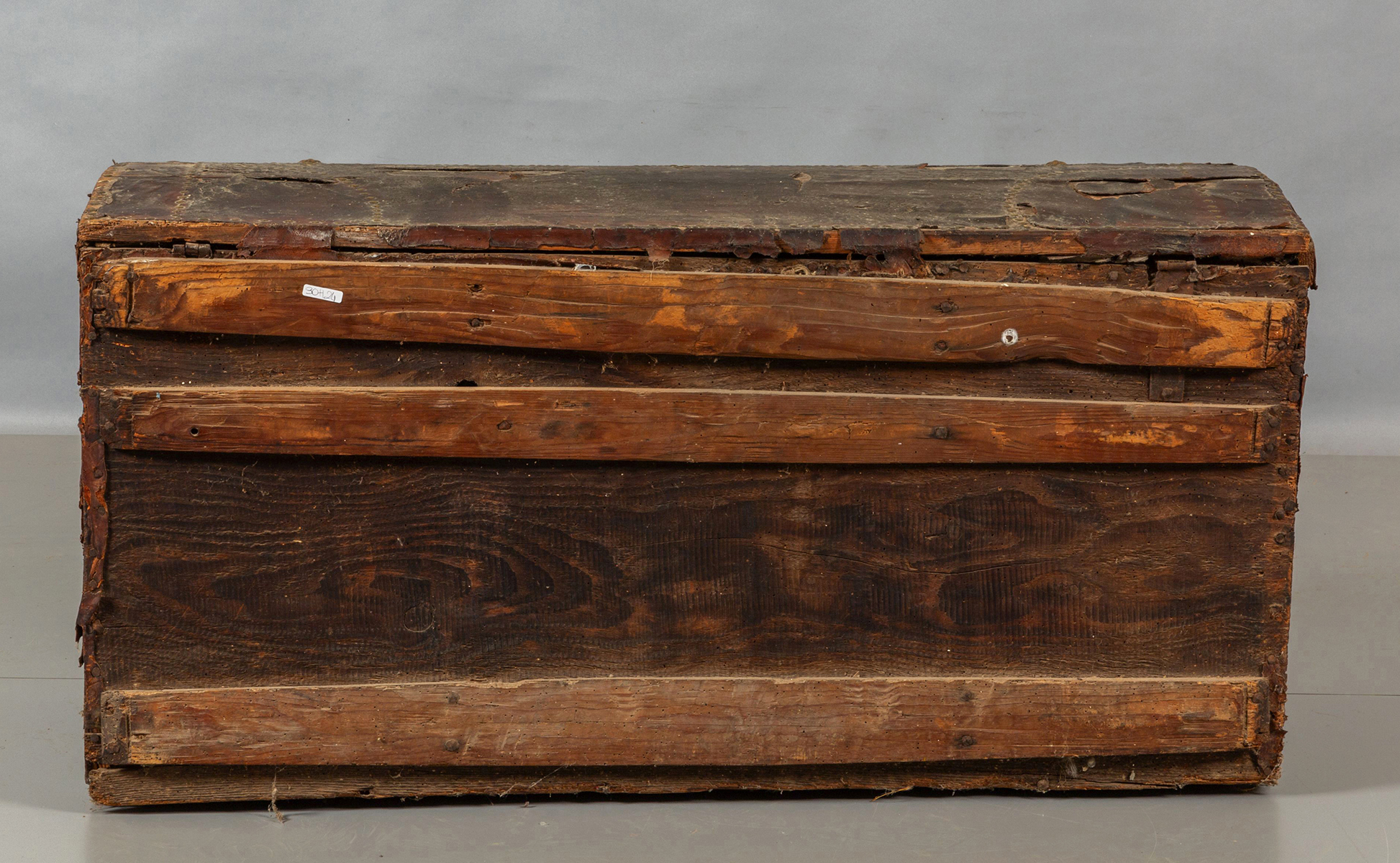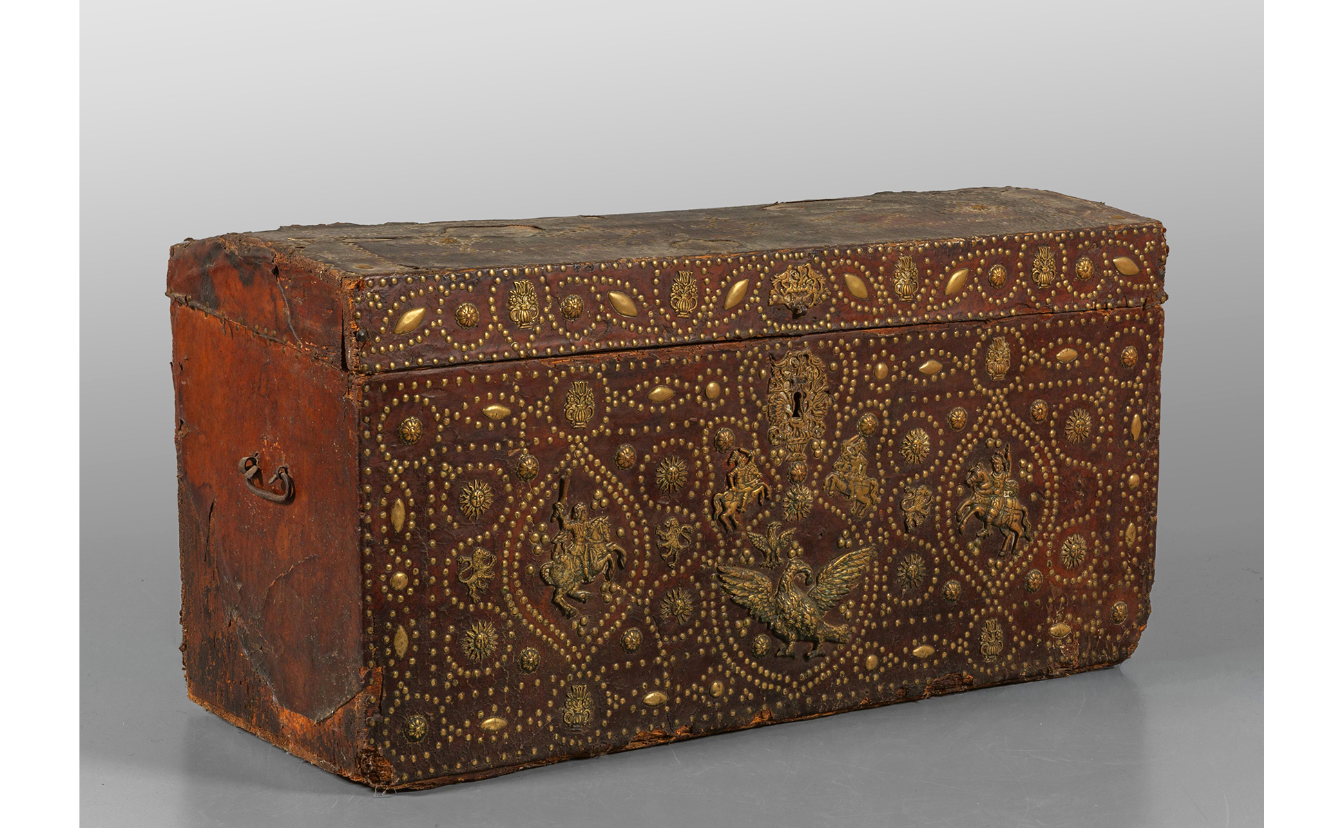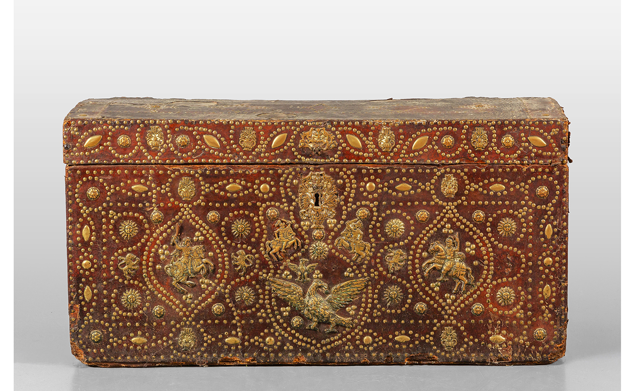 Baule in cuoio borchiato fronte decorato con motivi allegorici Spagna inizi sec.XVIII