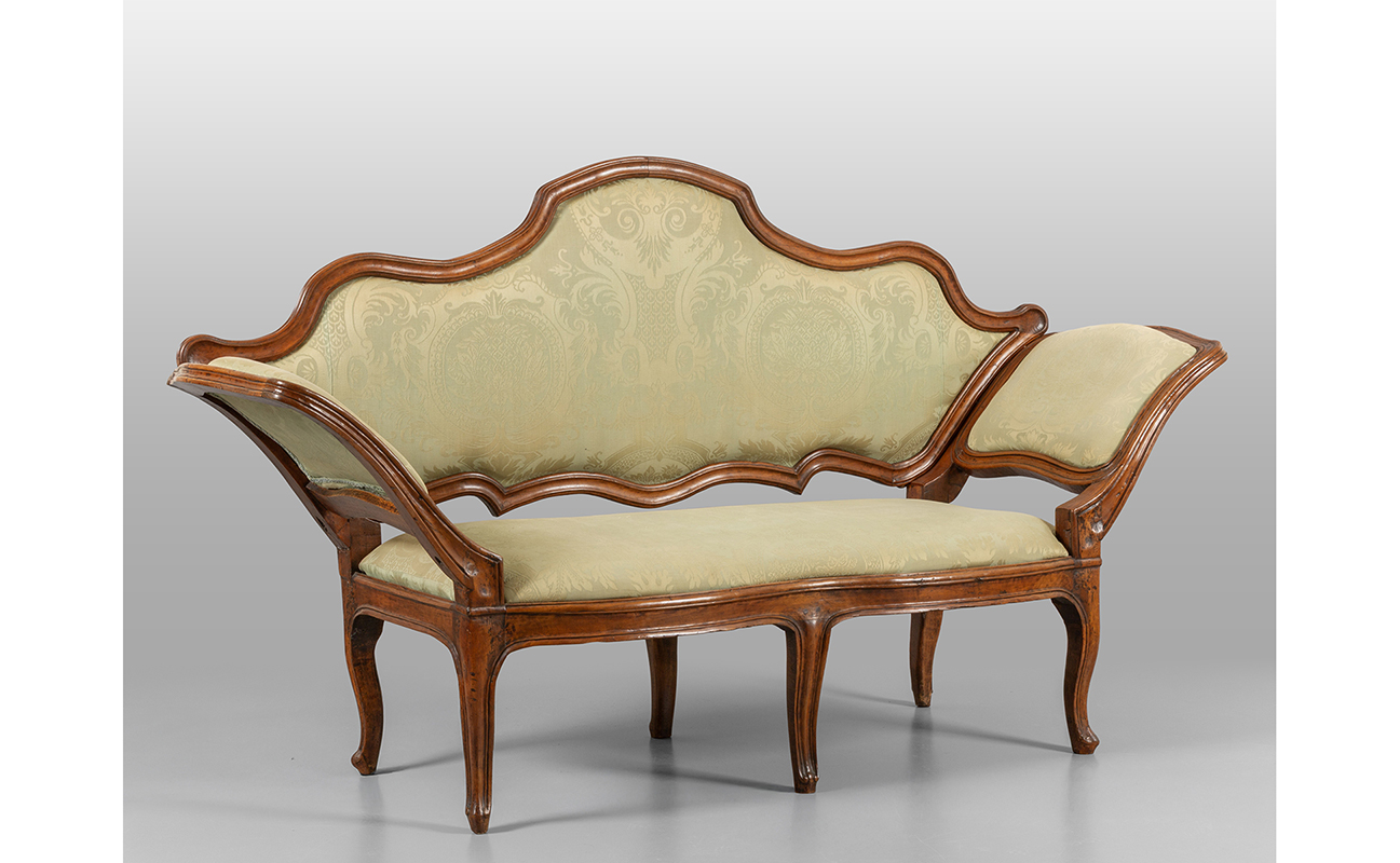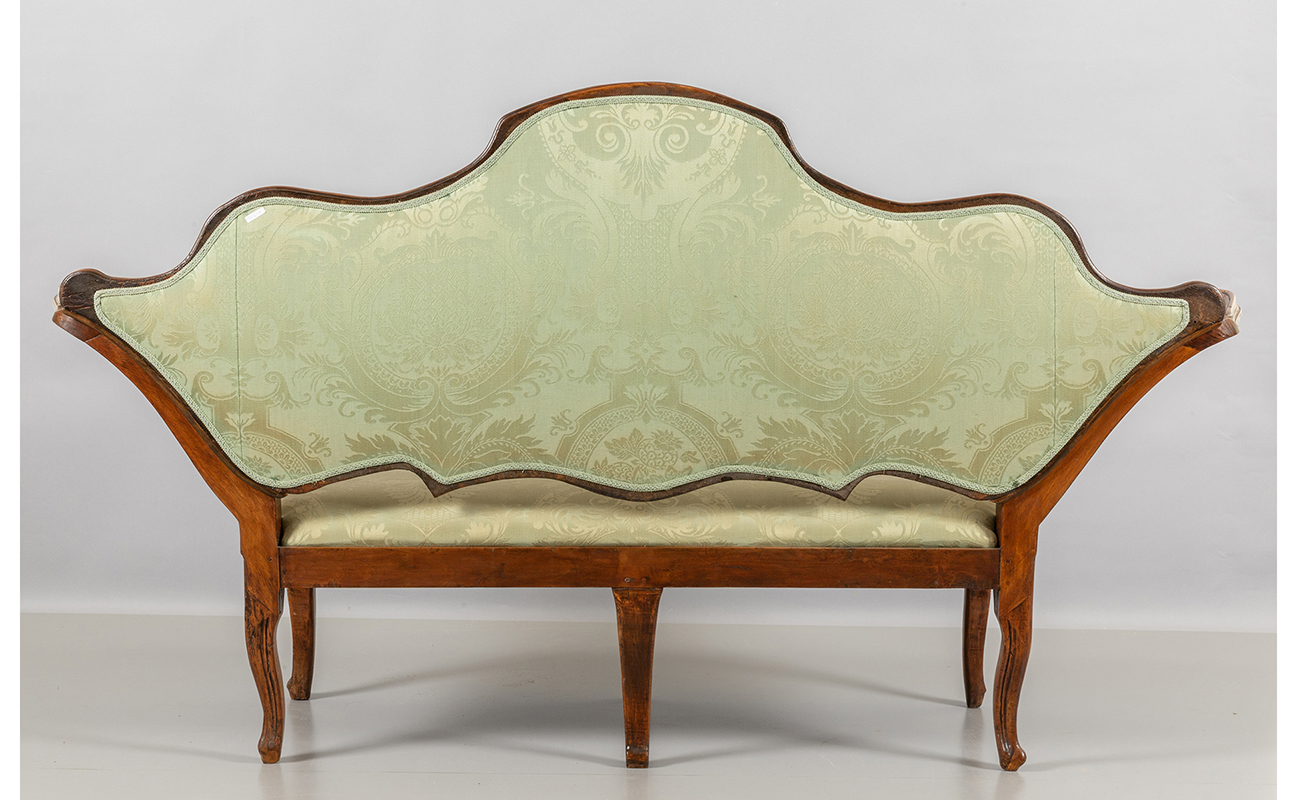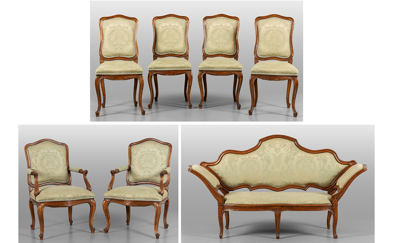 Divano Luigi XV in noce Piemonte sec XVIII e due poltrone e quattro sedie analoghe