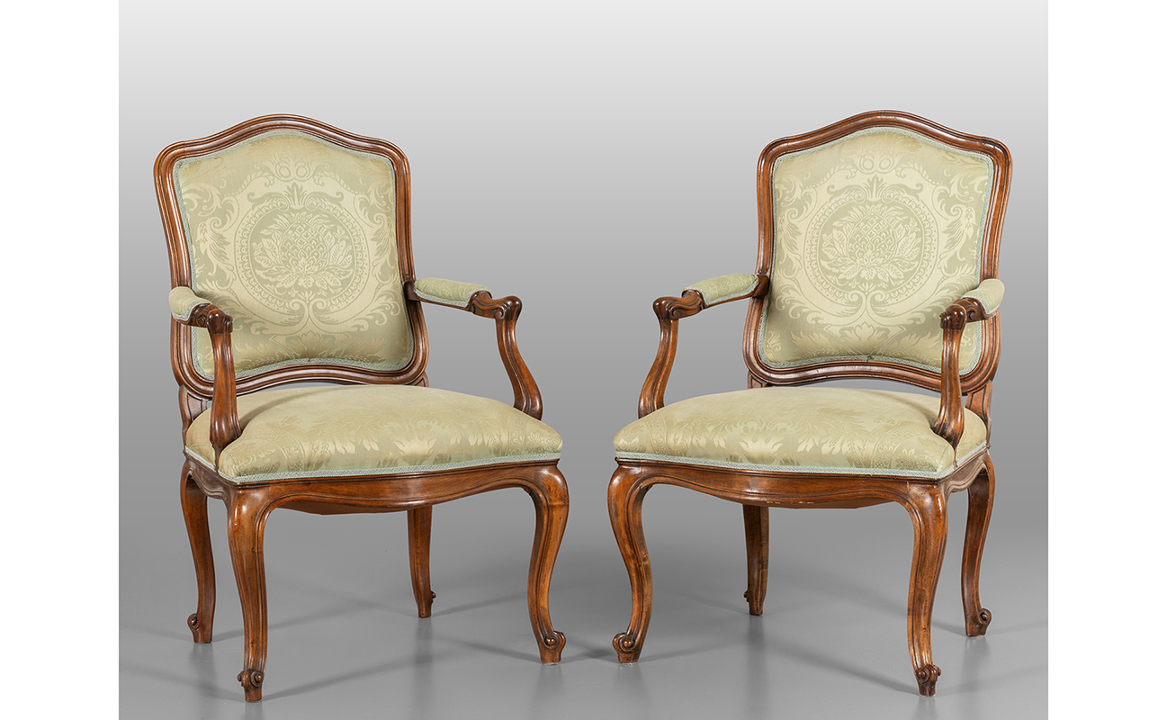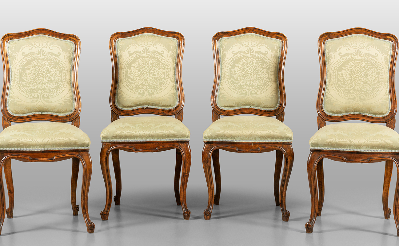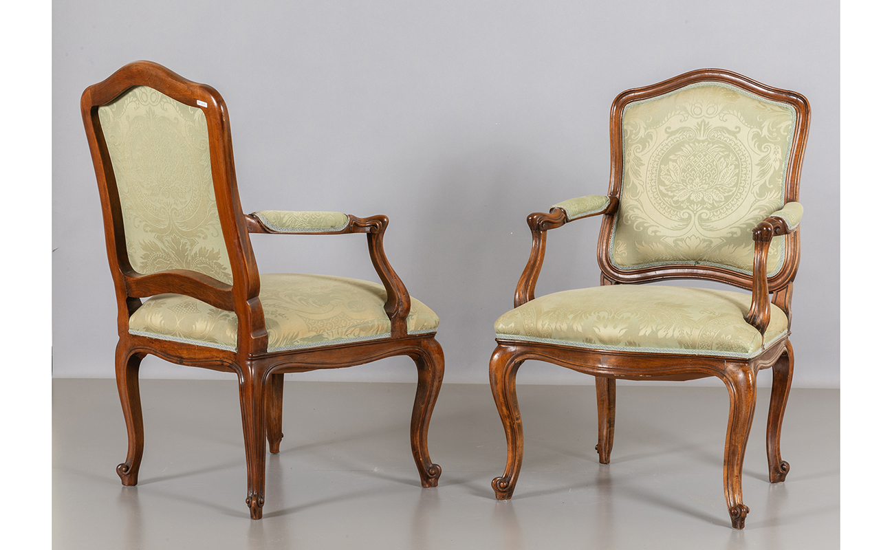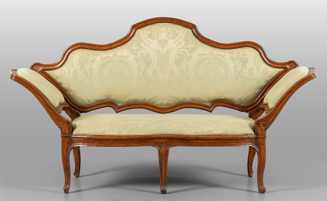 Divano Luigi XV in noce Piemonte sec XVIII e due poltrone e quattro sedie analoghe