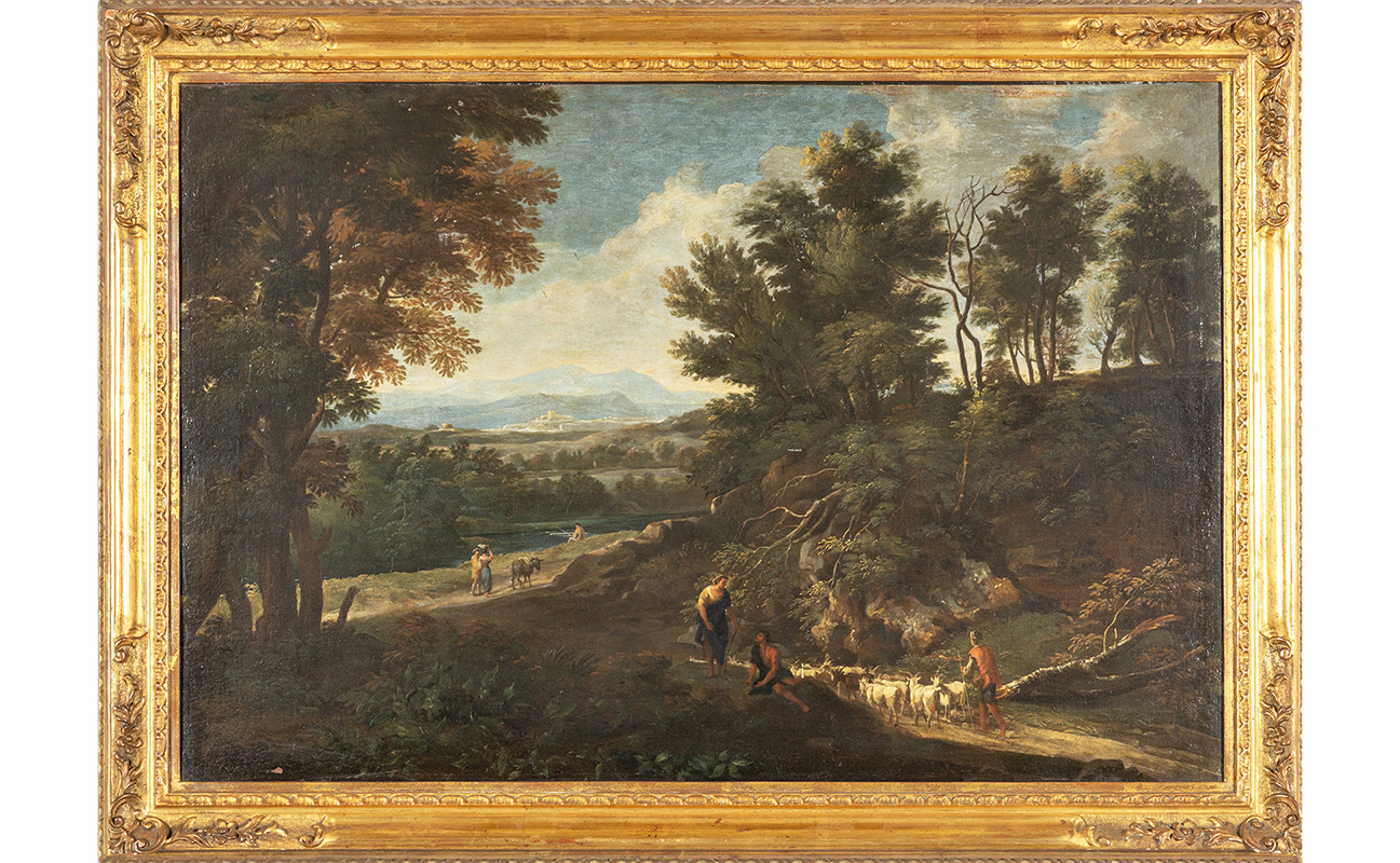 Scuola romana I metà sec.XVII 'Paesaggio con viandanti' olio