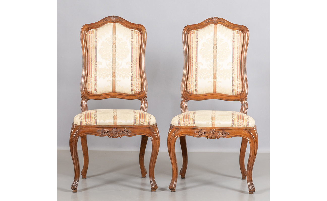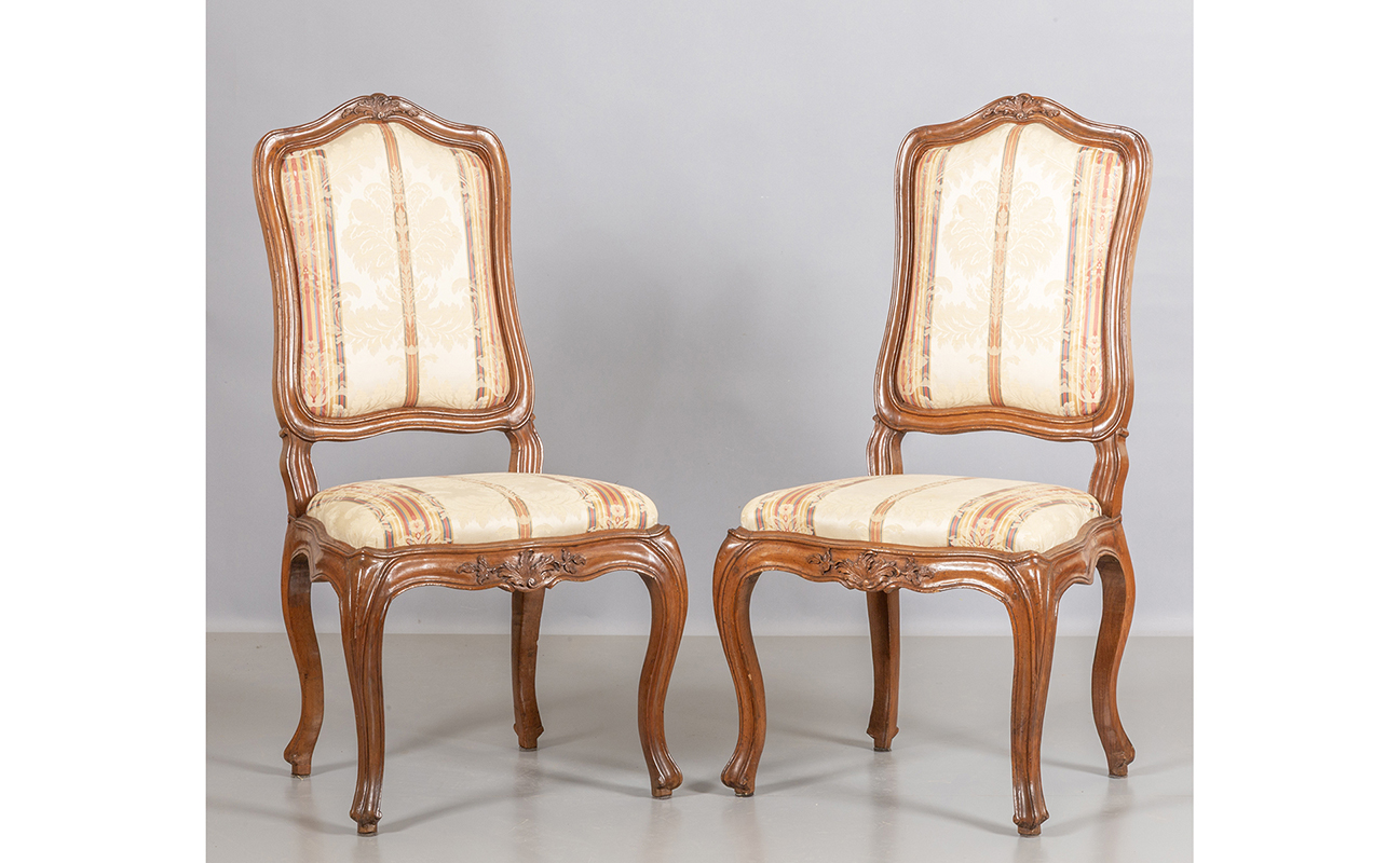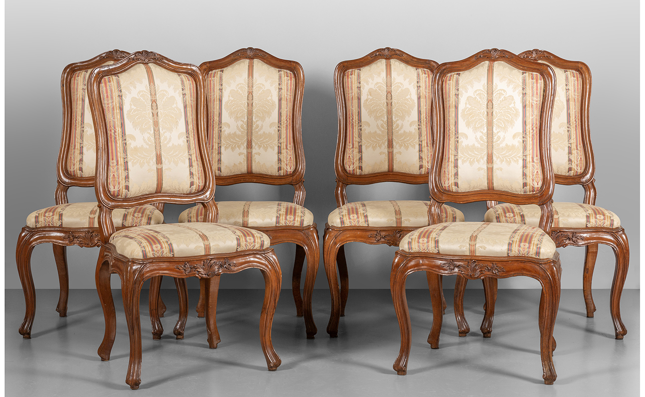 Sei sedie Luigi XV in noce con sedute e schienali imbottiti Genova sec.XVIII