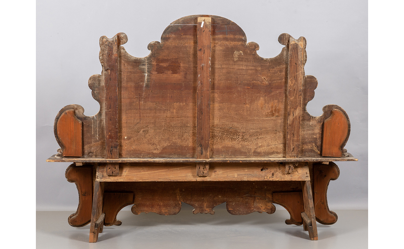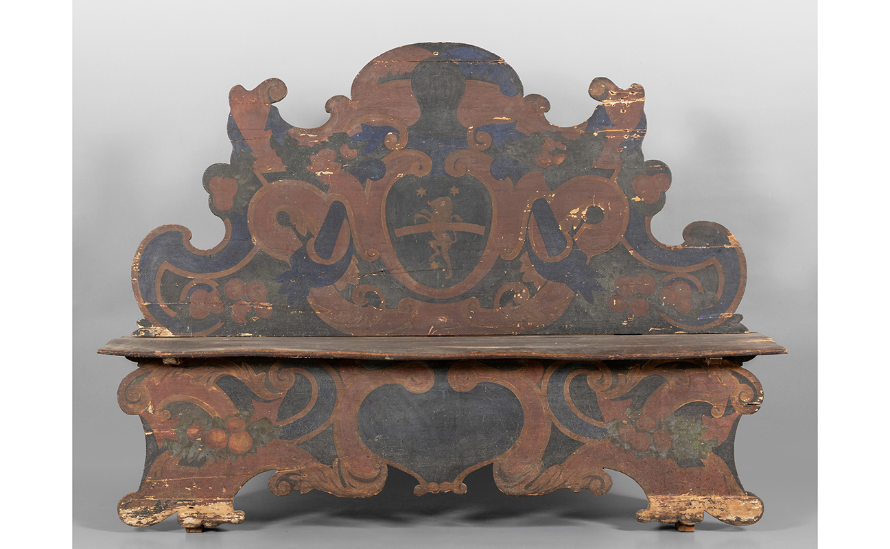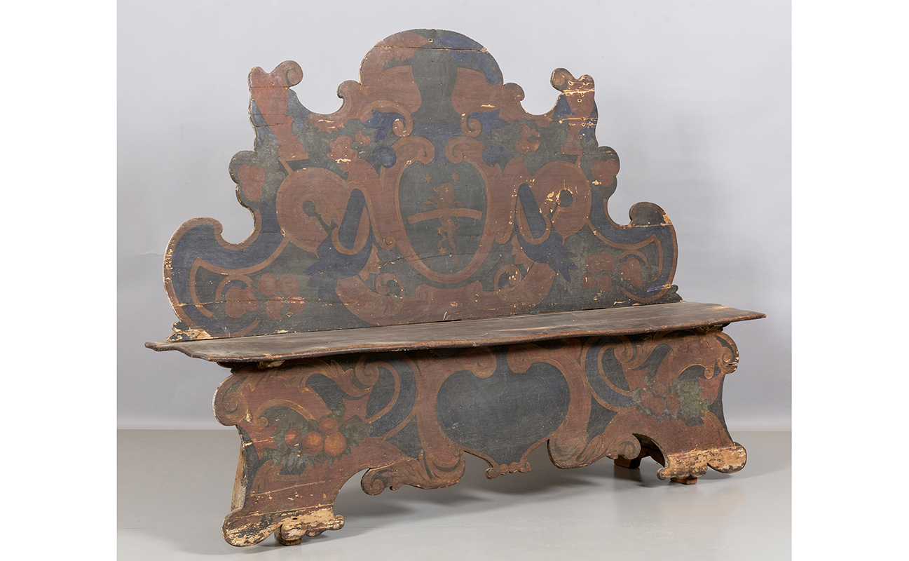 Cassapanca in legno intagliato e dipinto con al centro stemma nobiliare sec.XVIII