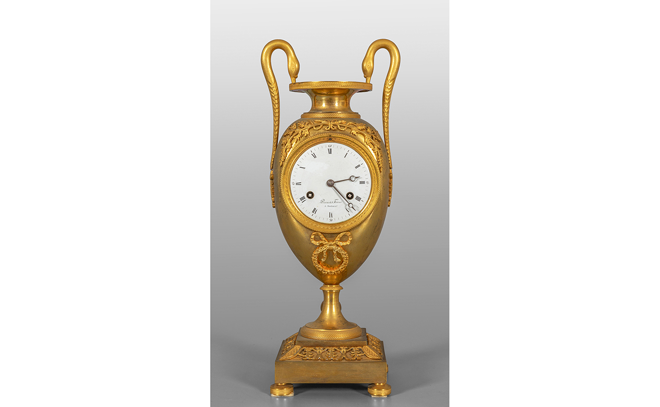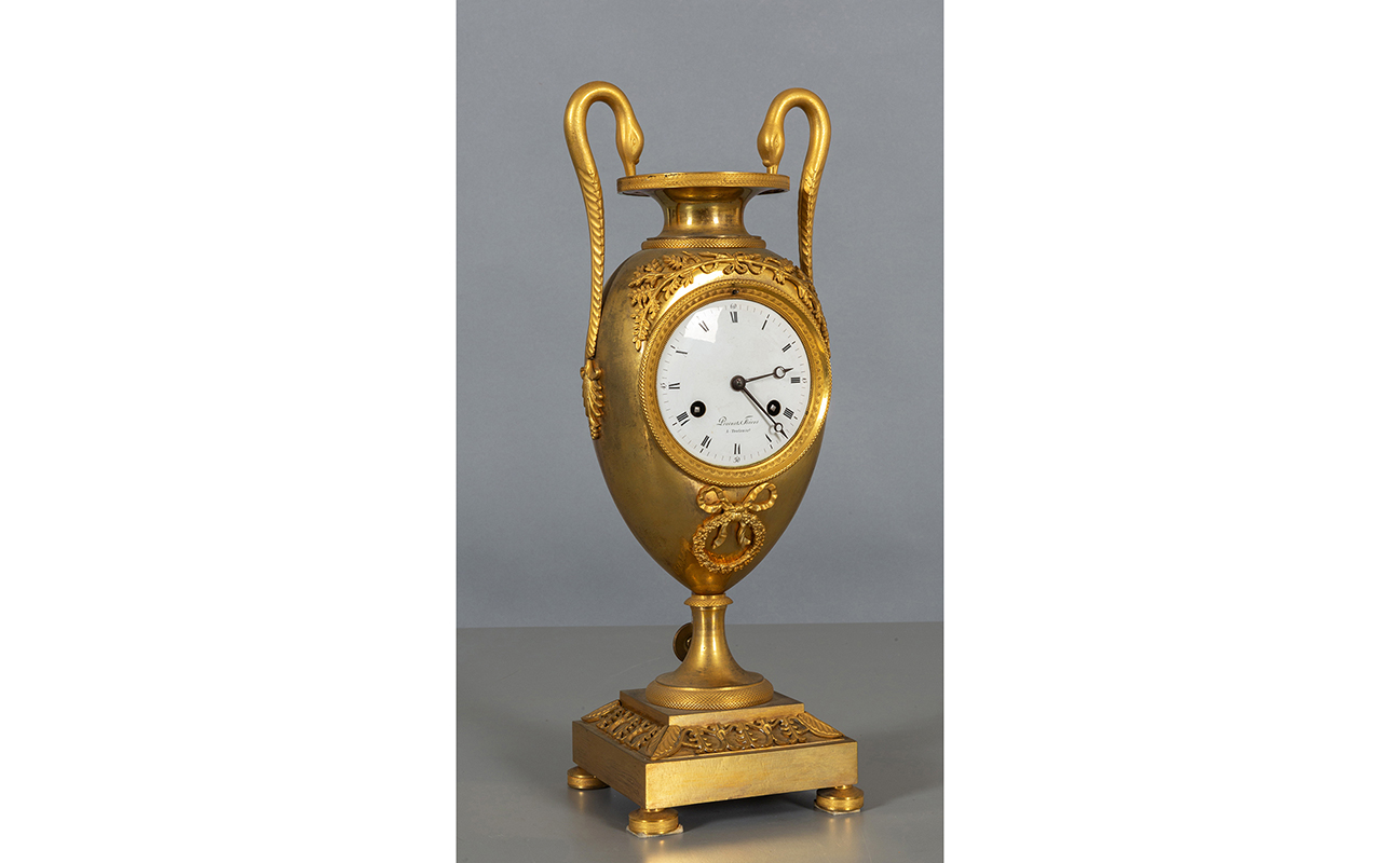 Orologio in bronzo dorato a forma di anfora quadrante in smalto f.to Prevost Fréres à Toulon Francia inizi sec.XIX