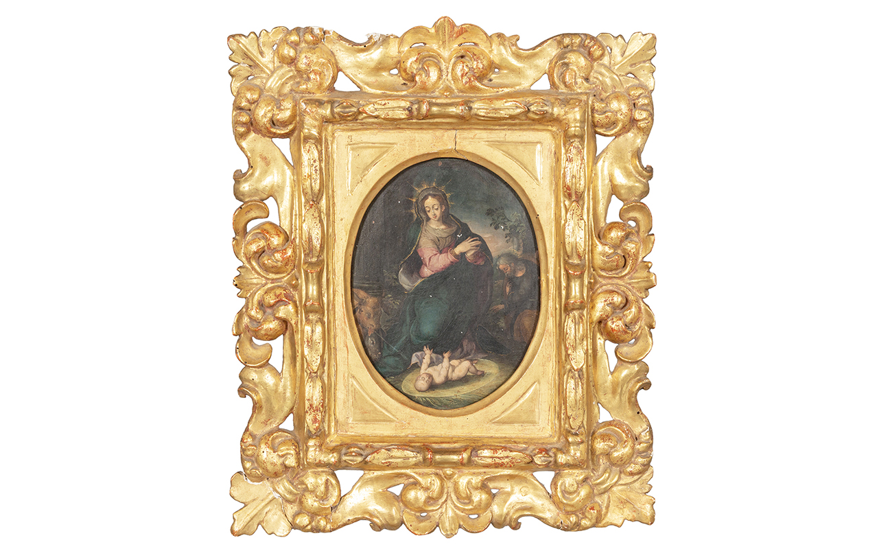 Scuola lombarda sec.XVII 'Madonna con Bambino' olio su rame di forma ovale cornice coeva in legno intagliato e dorato