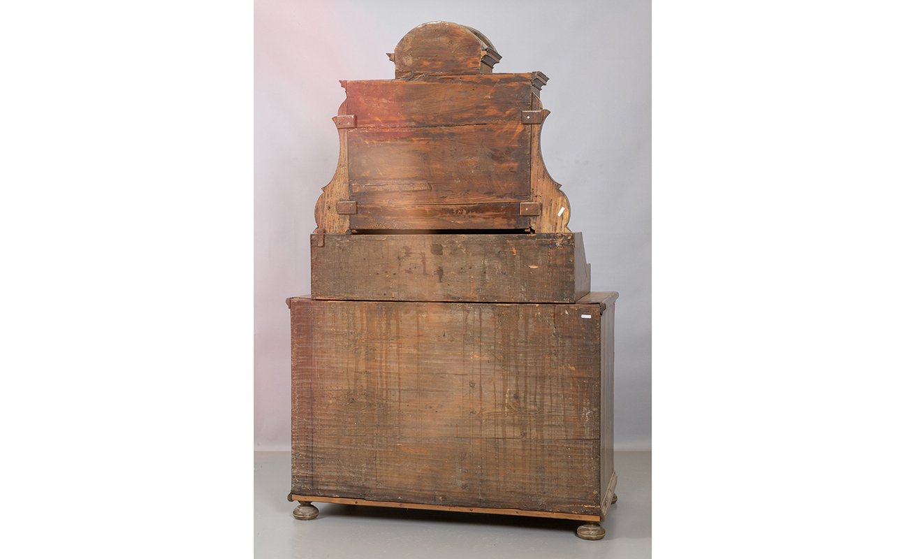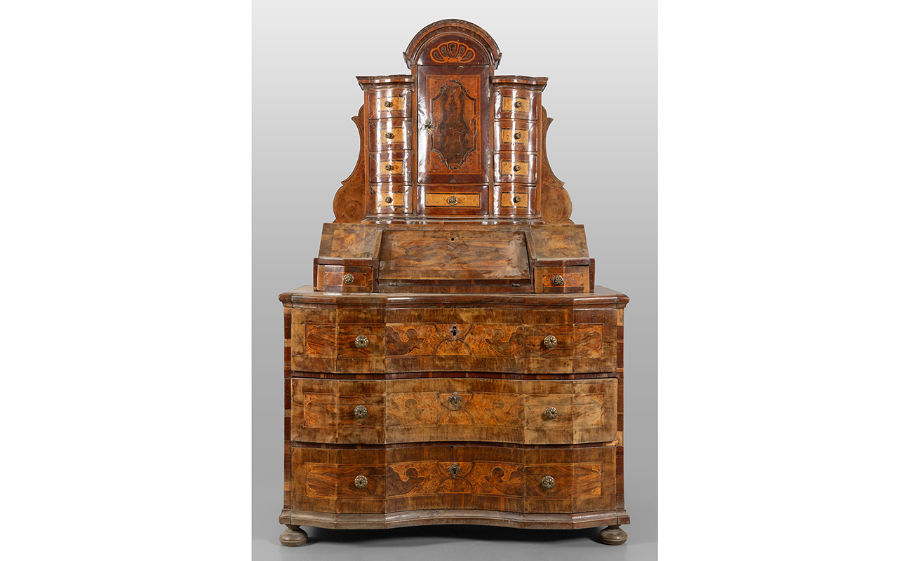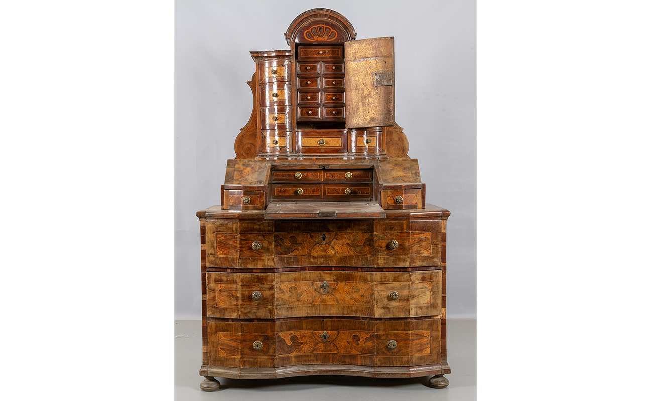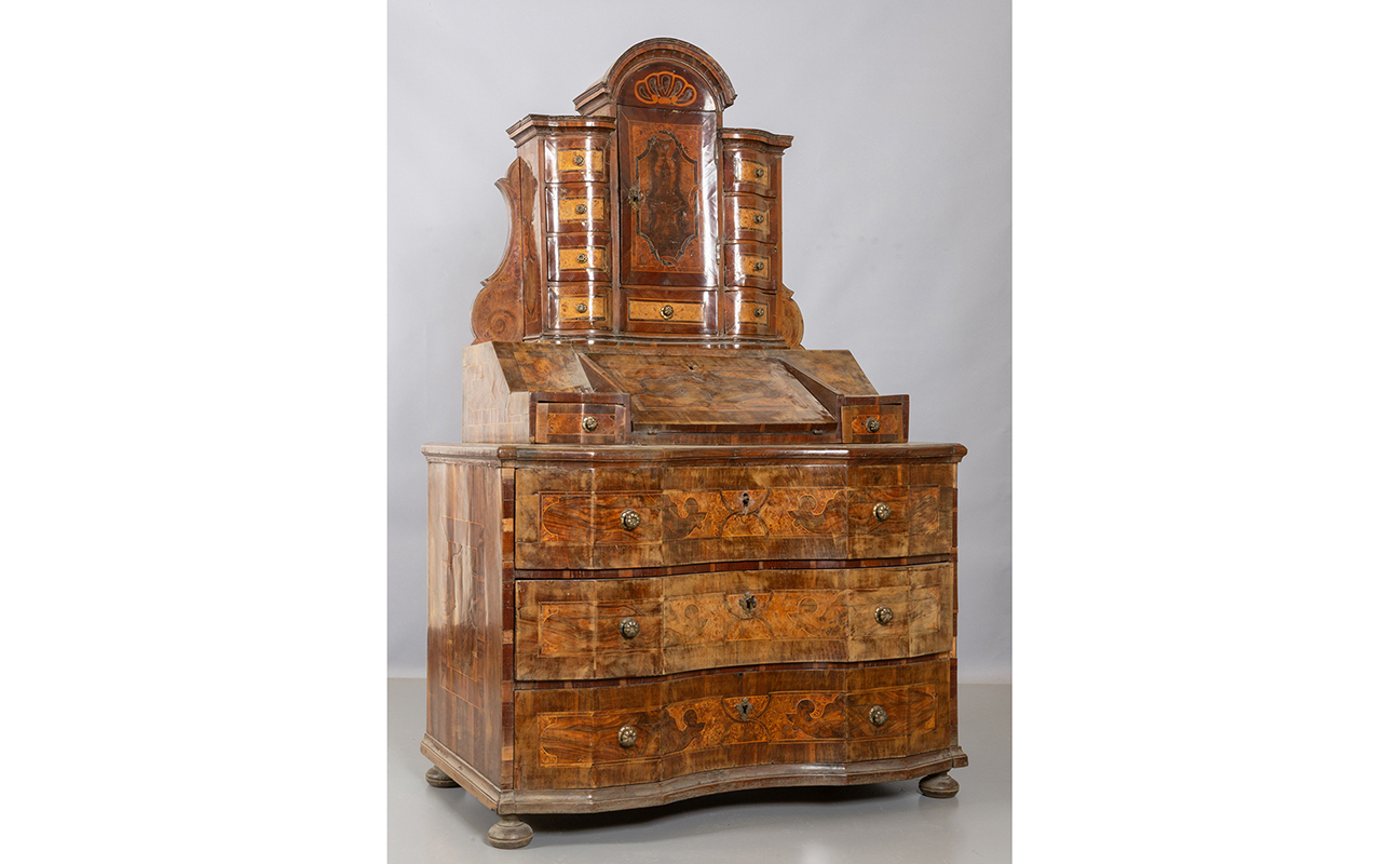 Comò con alzata a tre cassetti movimentato sul fronte parte superiore con ribalta a scrittoio contornata da due cassetti alzata con sportello nove cassetti piccoli sui lati lastronato in radica e filettato in bois de rose Alto Veneto sec.XVIII
