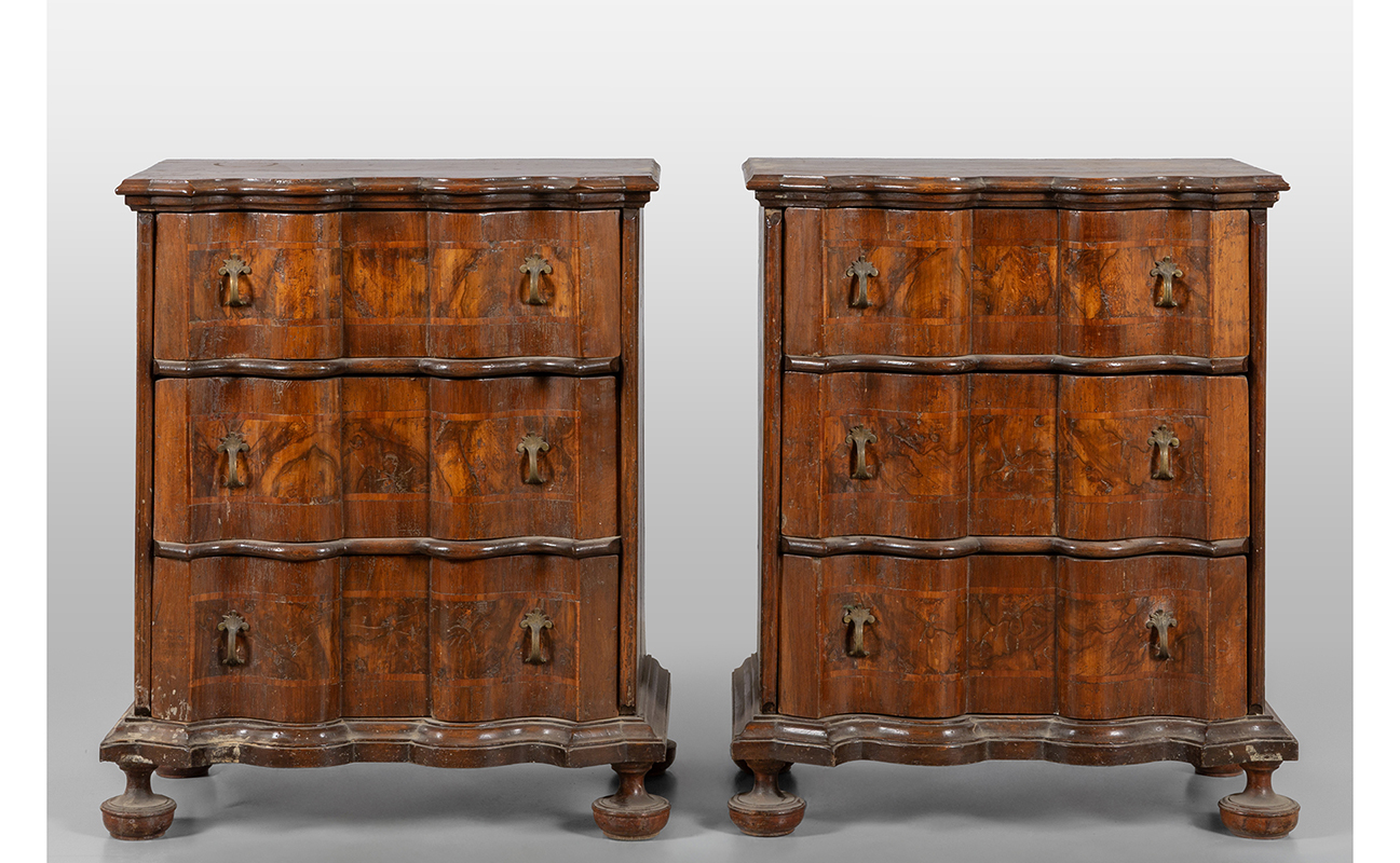 Coppia di mobiletti a tre cassetti movimentati sul fronte lastronati in radica piedi a cipolla Veneto I metà sec.XVIII