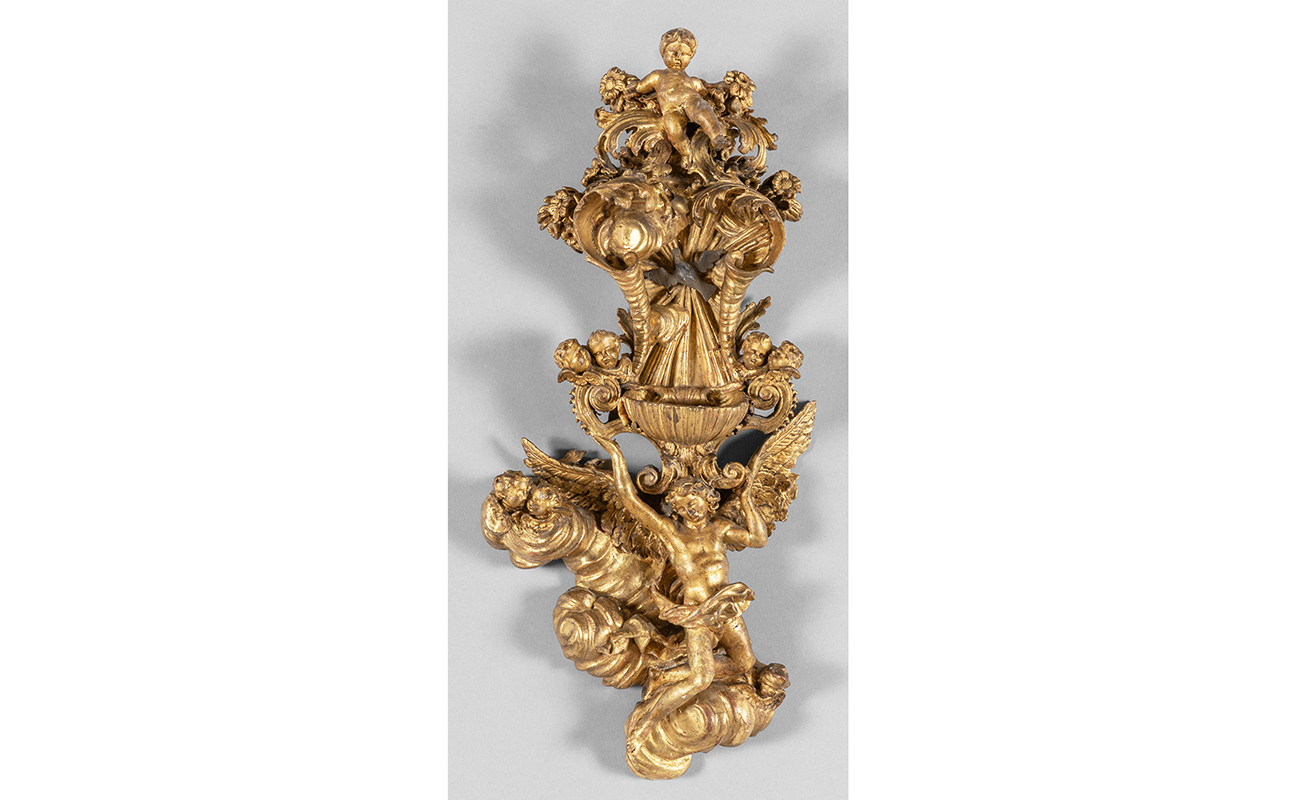Acquasantiera in legno finemente intagliato e dorato un angelo sorregge una coppa contornata da testine di angeli sovrastate da putto con volute nel centro colomba in argento Roma I metà sec.XVIII