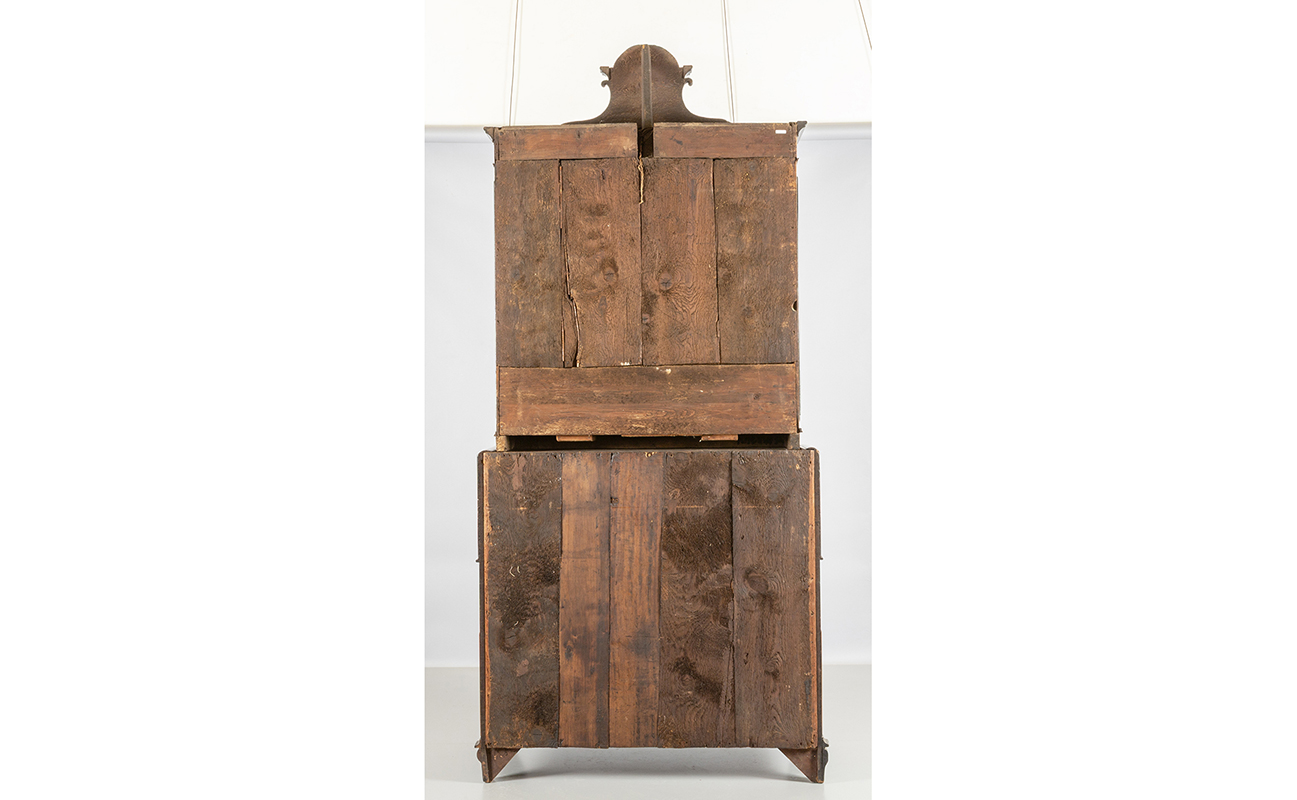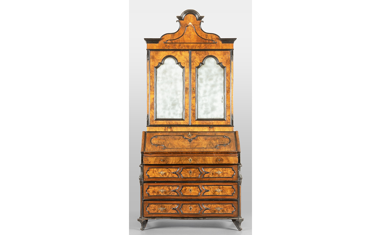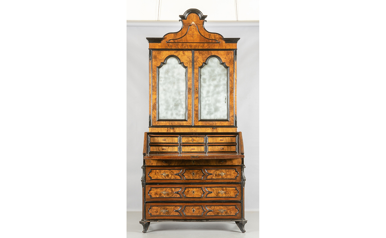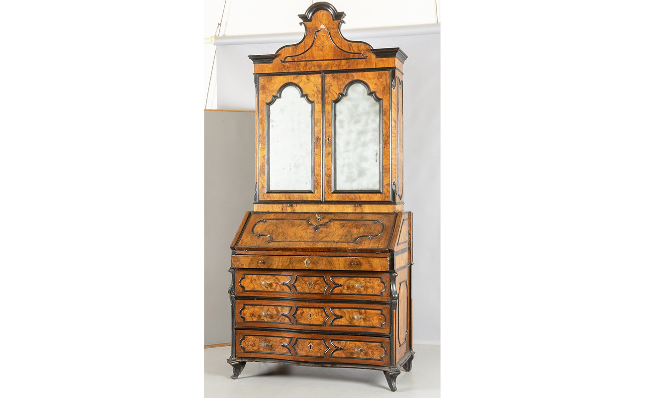 Mobile a doppio corpo lastronato in radica con cornicette nere parte inferiore movimentata sul fronte parte superiore a due sportelli con specchi cappello a carabiniere Lombardia I metà sec.XVIII