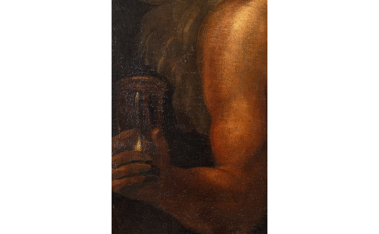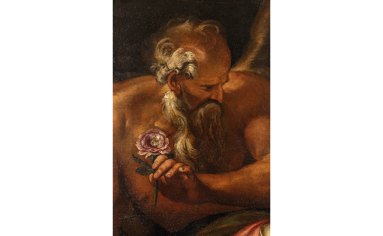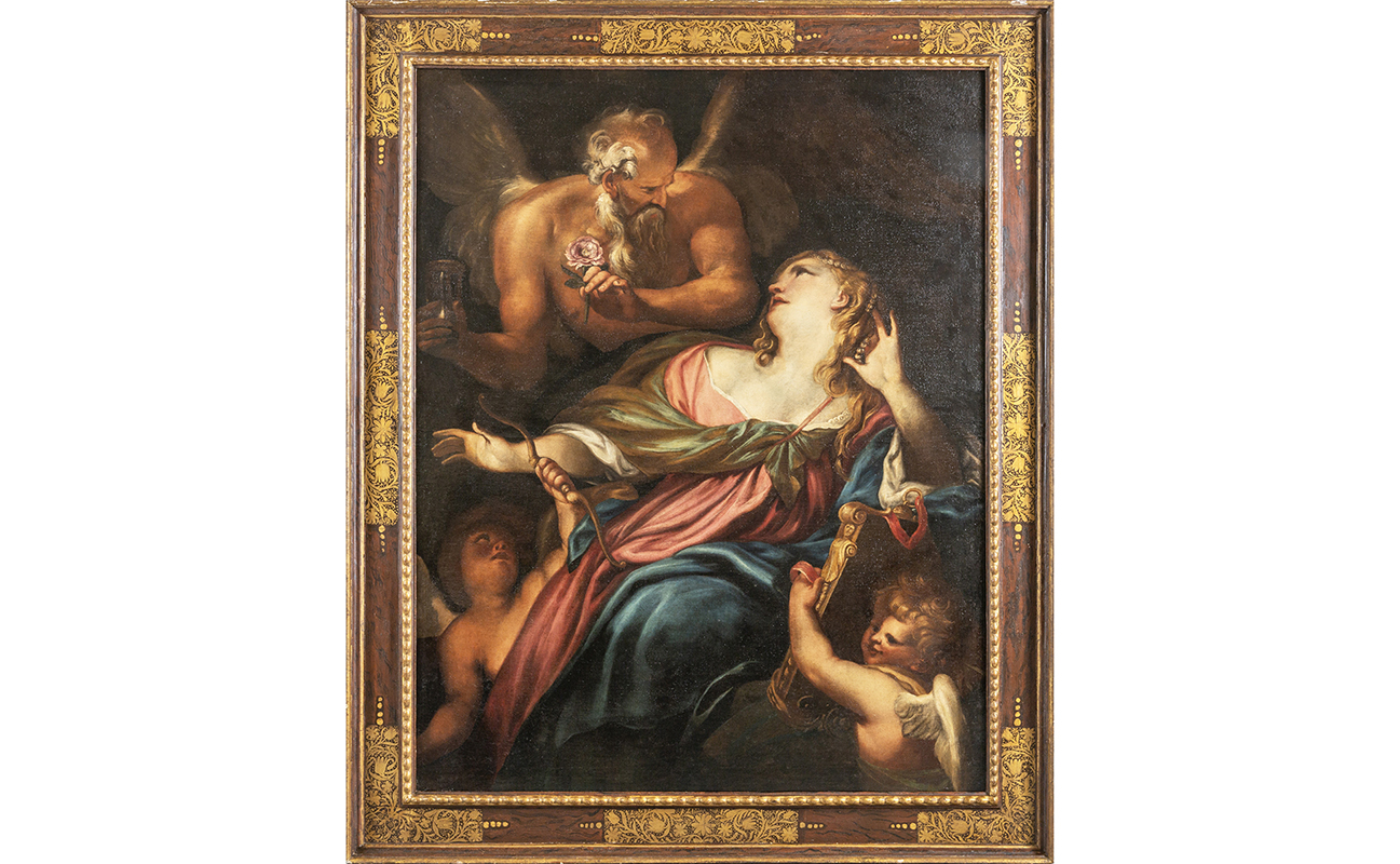 Raffinata composizione allegorica che testimonia la piena maturità artistica di Domenico Piola massimo esponente della pittura barocca genovese del XVII secolo. L'opera raffigura una scena mitologico-allegorica di grande suggestione dove il Tempo rappresentato come figura maschile alata con barba canuta e corpo muscoloso porge delicatamente una rosa a una giovane donna dall'incarnato luminoso personificazione della Bellezza.