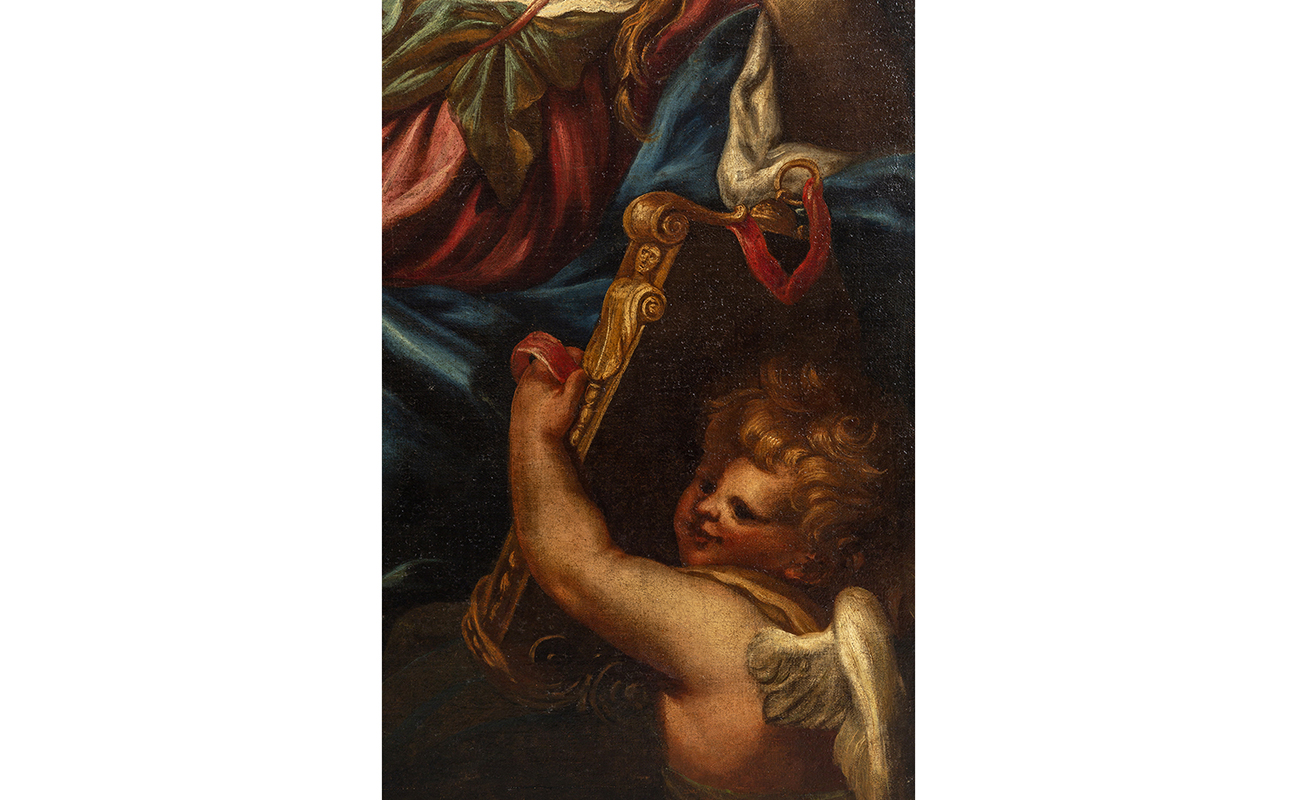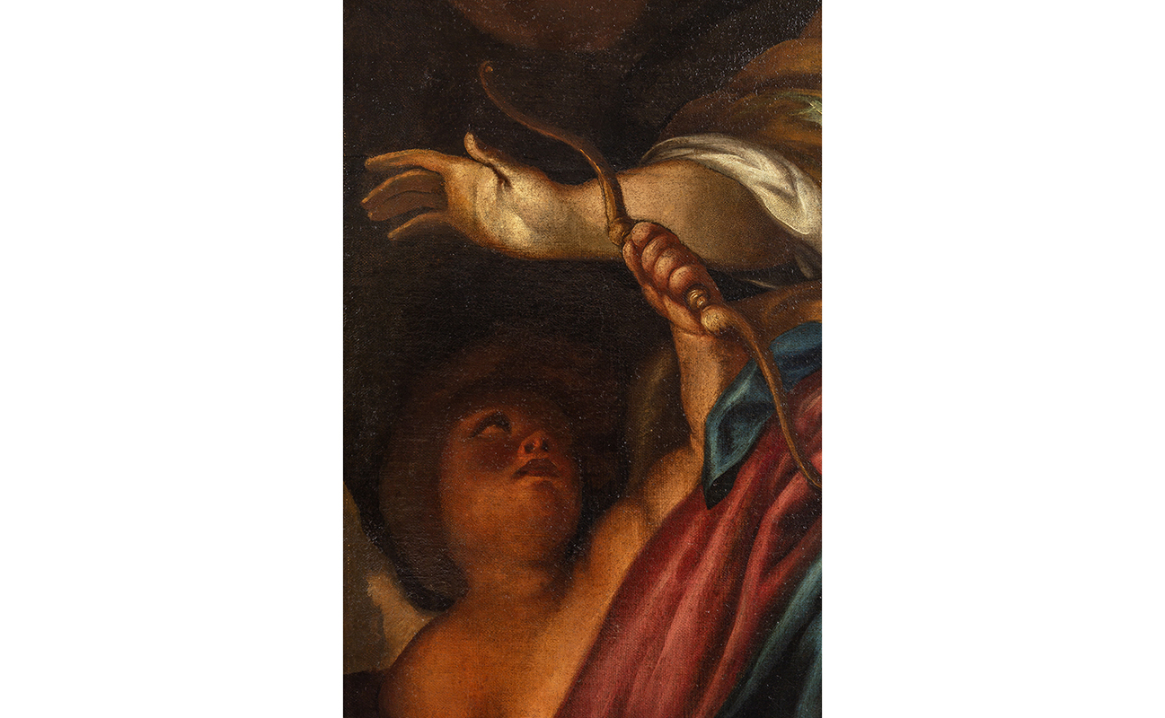 La composizione è arricchita dalla presenza di putti elementi decorativi ricorrenti nell'arte del maestro genovese che assistono alla scena conferendole un carattere di grazia e levità. Il fondo scuro tipico della tradizione caravaggesca ancora influente nell'ambiente artistico del tempo fa risaltare con efficace contrasto le carni luminose e i colori brillanti degli abiti.