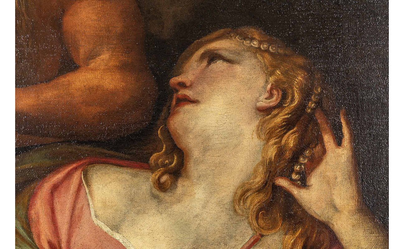 La protagonista femminile è ritratta in posizione semi-reclinata con il volto rivolto verso l'alto in espressione di languida contemplazione. Il suo abbigliamento costituito da preziosi drappeggi in seta rosa e turchese rivela la maestria del Piola nel rendere la ricchezza cromatica e la consistenza dei tessuti. La posa elegante e la gestualità raffinata rimandano ai modelli della grande pittura veneziana filtrati attraverso la sensibilità barocca ligure.