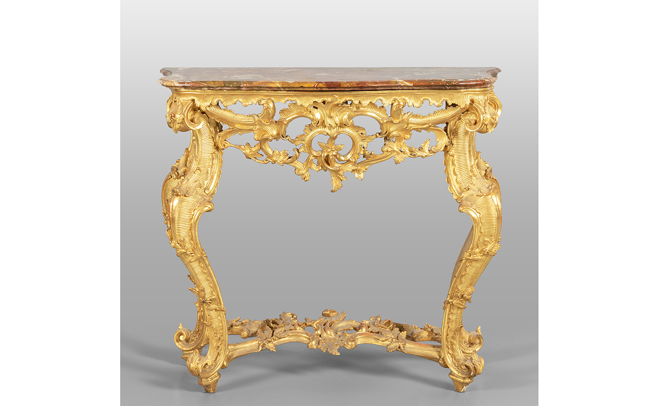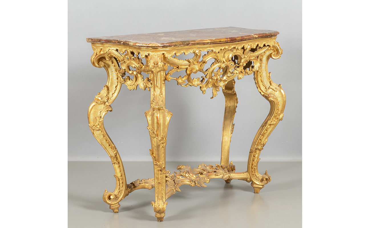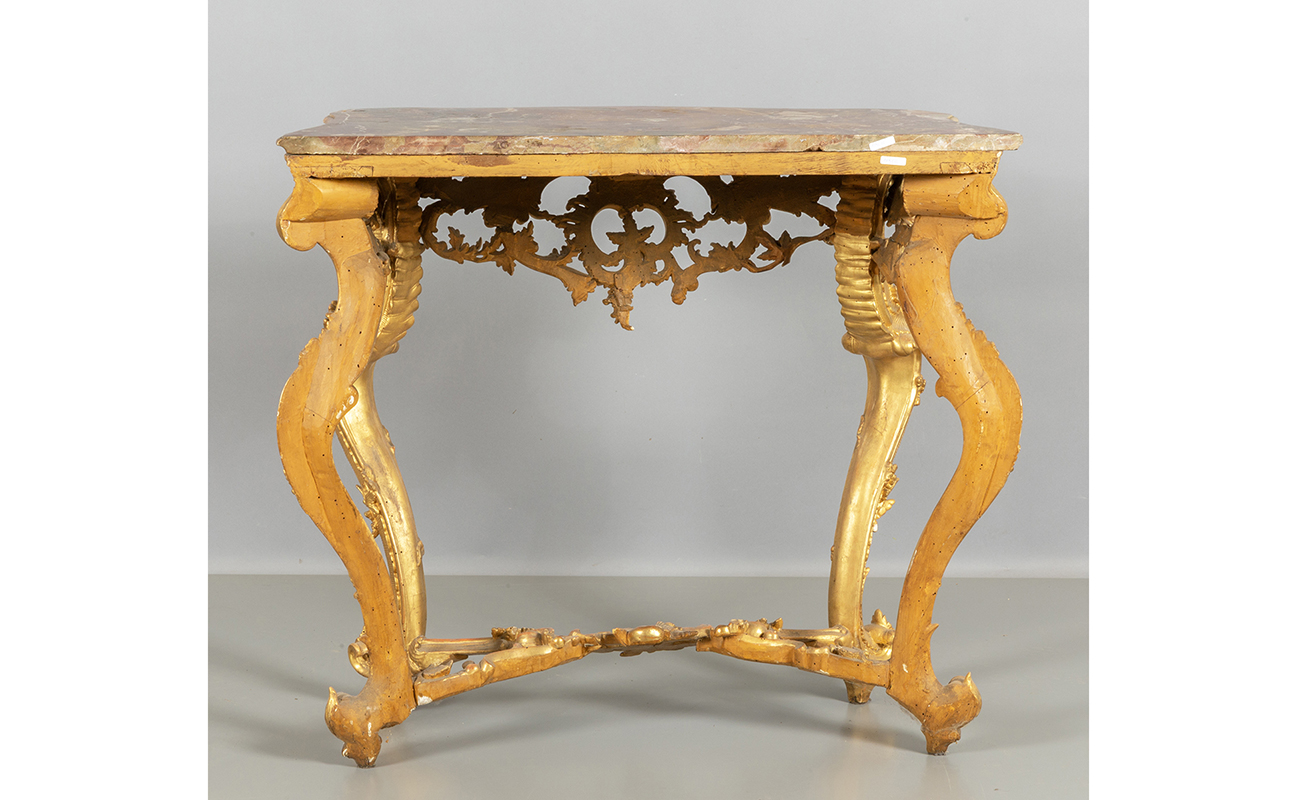 Console Luigi XV in legno finemente intagliato e dorato quattro gambe raccordate da crociera piano in marmo coevo Genova I metà sec.XVIII