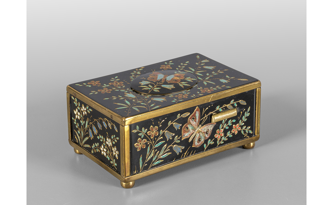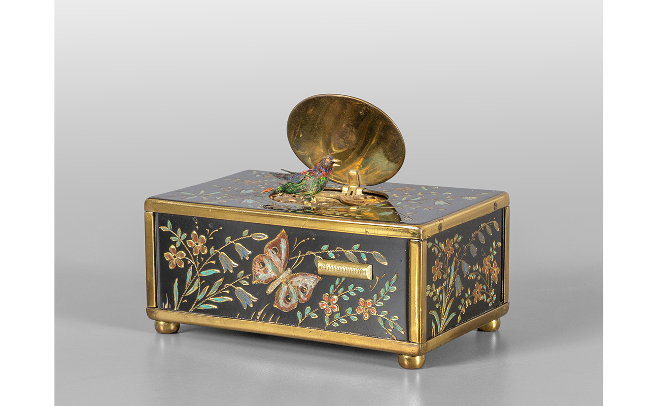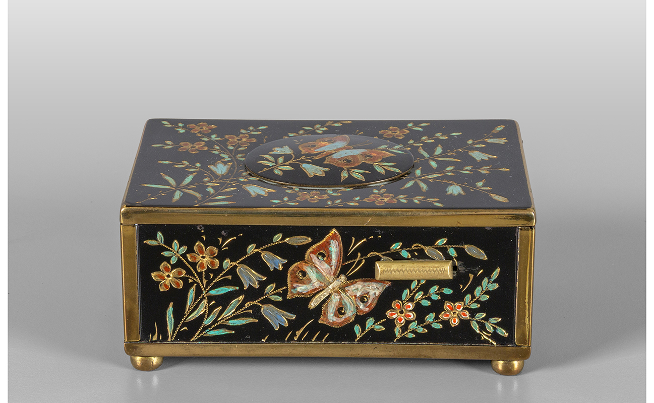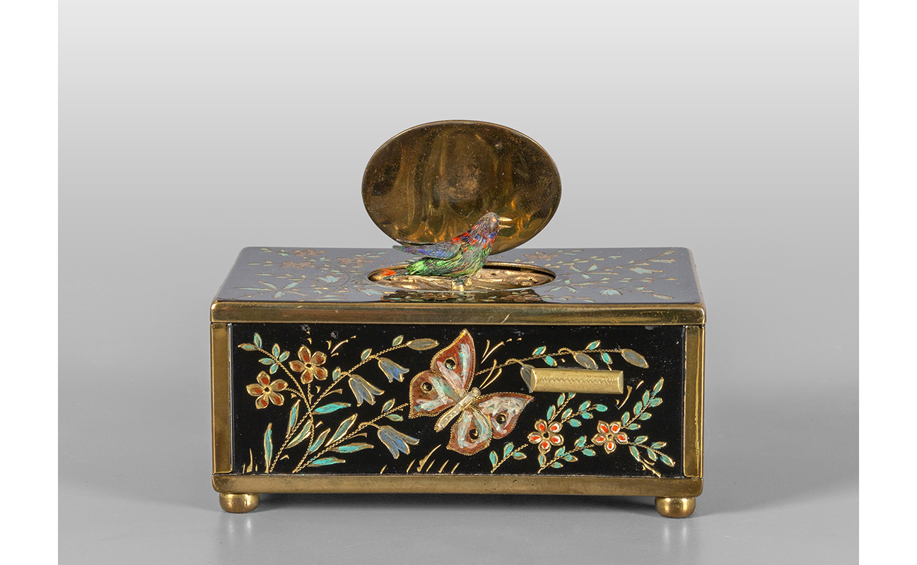 Scatoletta musicale con uccellino in smalto colorato con fiori e farfalle su fondo nero difetti nel funzionamento