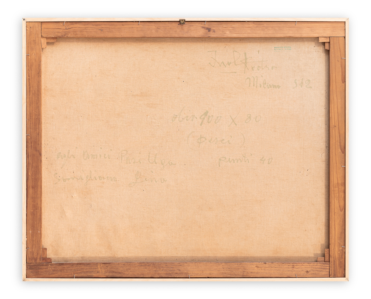 Firma, titolo, misure (in centimetri e in punti francesi), datazione, dedica ad personas e timbro dell'Artista al retro