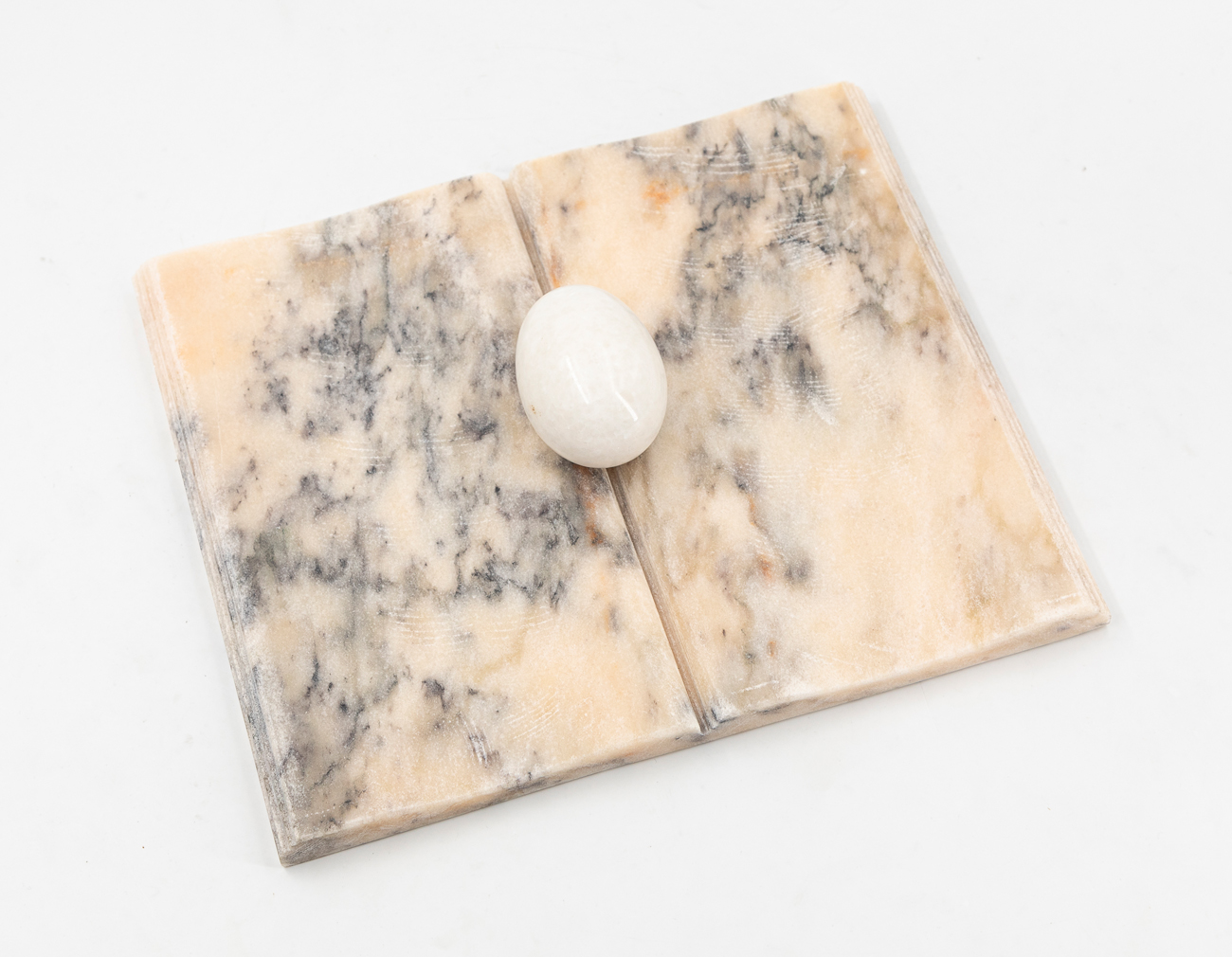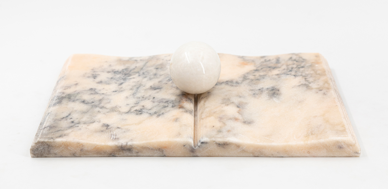 Scultura in marmo con applicazione di elemento mobile a forma di uovo