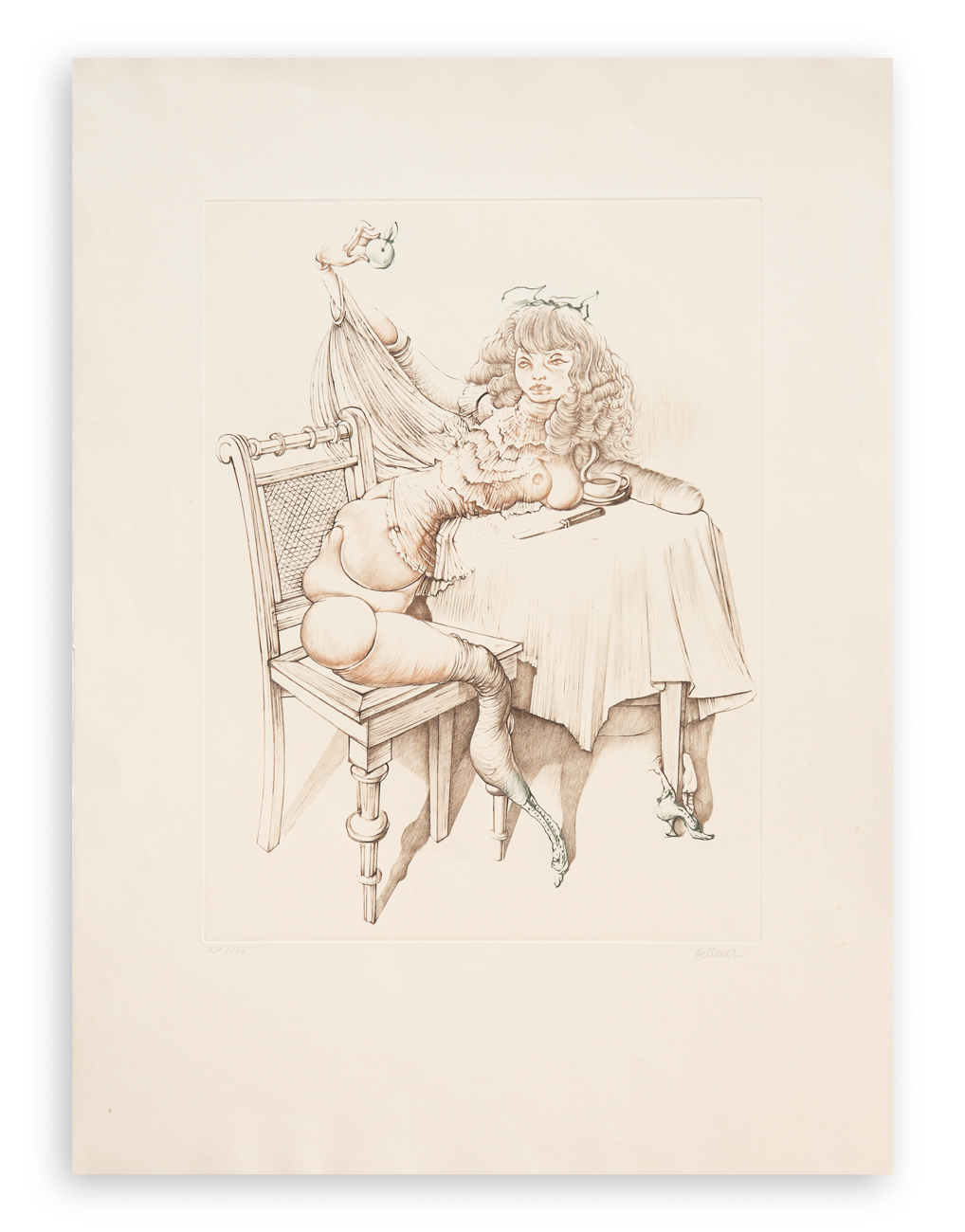Lotto 213 | HANS BELLMER (1902-1975) - Senza Titolo (Poupée désarticulée assise à table tenant une pomme)