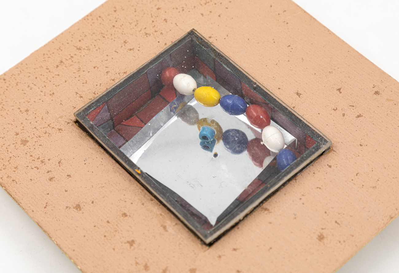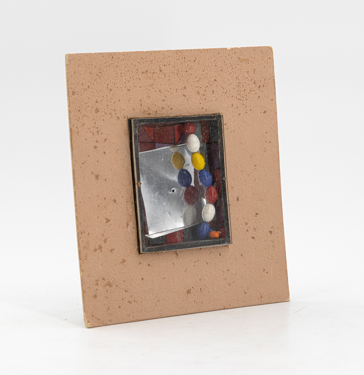 Assemblage (cassetta di legno, collage di carte colorate e applicazione di materiali plastici)