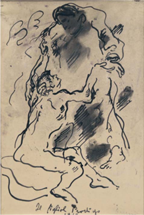 CARENA FELICE Cumiana (TO) 1879 - Venezia 1966 Il figliol prodigo 1949 disegno a china su carta 30x21 cm firma data e titolo in basso la carta presenta lievi fluorescenze