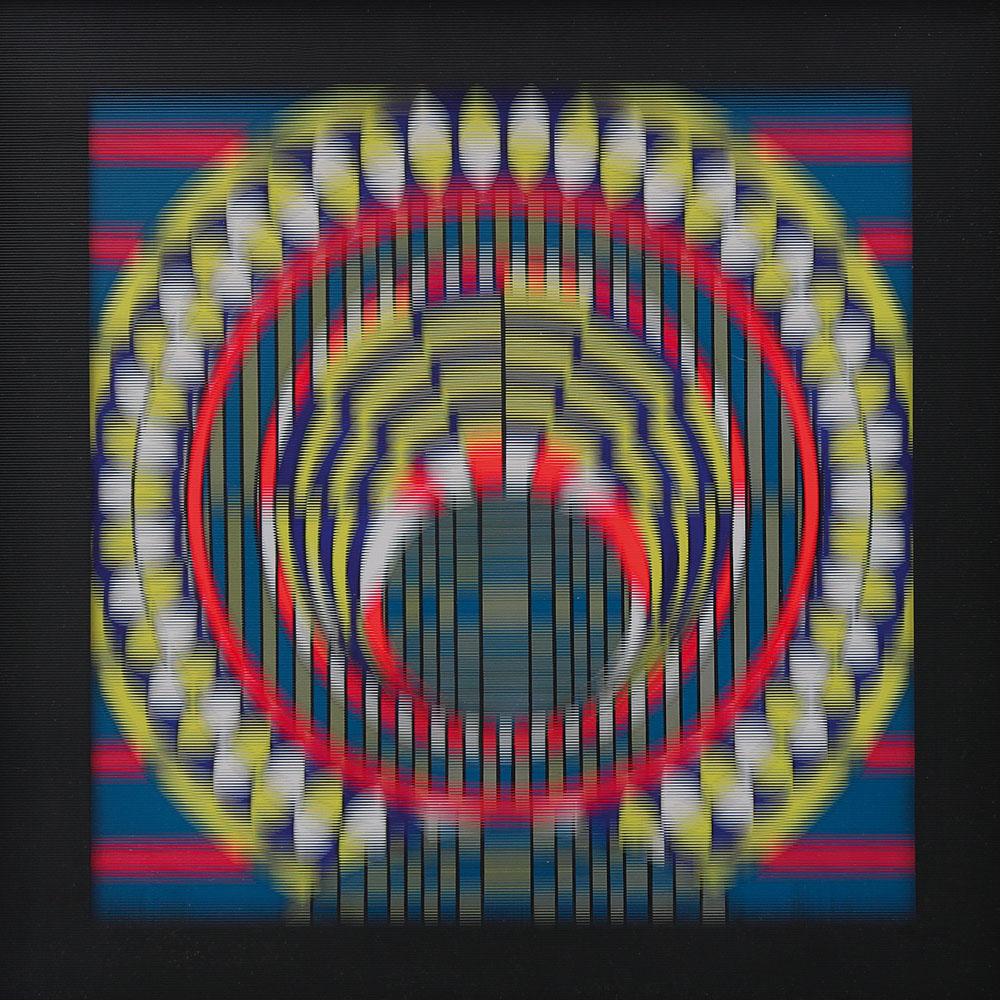 tecnica mista su cartoncino con copertura in plexiglass zigrinato a linee orizzontali cm. 50x50, opera non firmata, etichetta e timbri dell'artista al retro, dichiarazione d'autenticità e timbro dell'artista su certificato della Anti: galleria d'arte contemporanea (Mestre-VE) allegato.