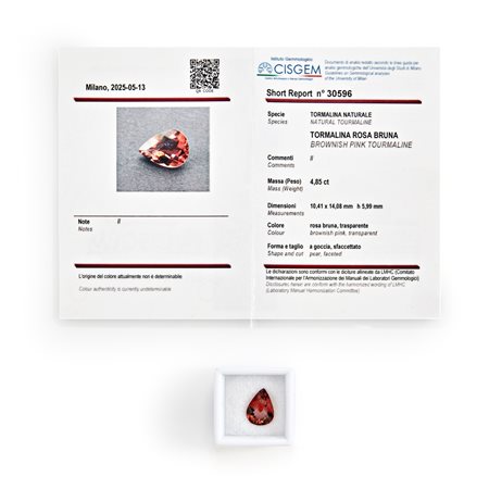 Precedente Lotto 205 Successivo Finarte - Via dei Bossi 2, 20121 Milano Gemme / Tutti i colori della natura Sessione unica martedì 23 settembre 2025 ore 11:00 (UTC +01:00) Tormalina rosa bruna in cartina ct 4,85 mm 10,41 x 14,08 h mm 5,99 di forma a goccia, taglio sfaccettato.
