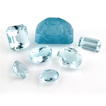 Lotto di sette acquemarine in cartina per totale ct 30,95 misure diverse da mm 6,00x8,00 a mm 12,00x16,00 circa