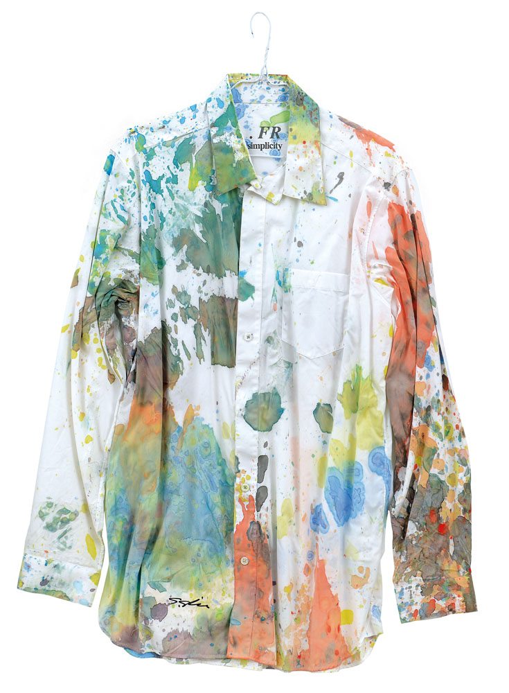 colori ad acqua su camicia cm. 90x70, firma in basso al centro, dichiarazione d'autenticità dell'artista su certificato di autenticità della Associazione Shozo Shimamoto allegato.