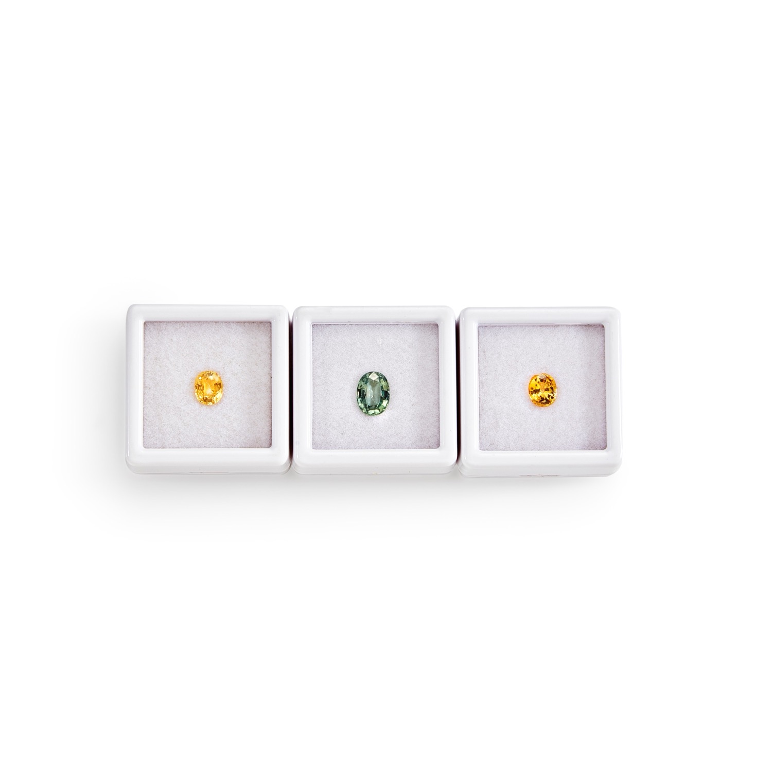Lotto di tre corindoni gialli e verdi in cartina per totale ct 3,26 misure diverse da mm 5,00x6,00 a mm 6,00x8,00 circa