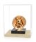 scultura in bronzo dorato diametro cm. 10x1,5; esemplare 200/250, firma in basso sulla destra, entro teca in plexiglass cm. 21x17x17.