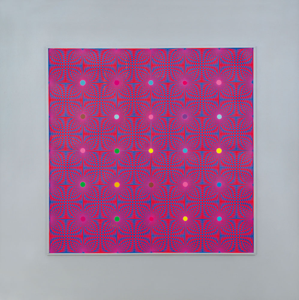 collage di serigrafie cm. 92x92 su telaio (tavola) cm. 140x140, firma, titolo, anno, tecnica e timbri dell'artista e del Gruppo N al retro, dichiarazione d'autenticità n° S 20 dell'artista su foto.