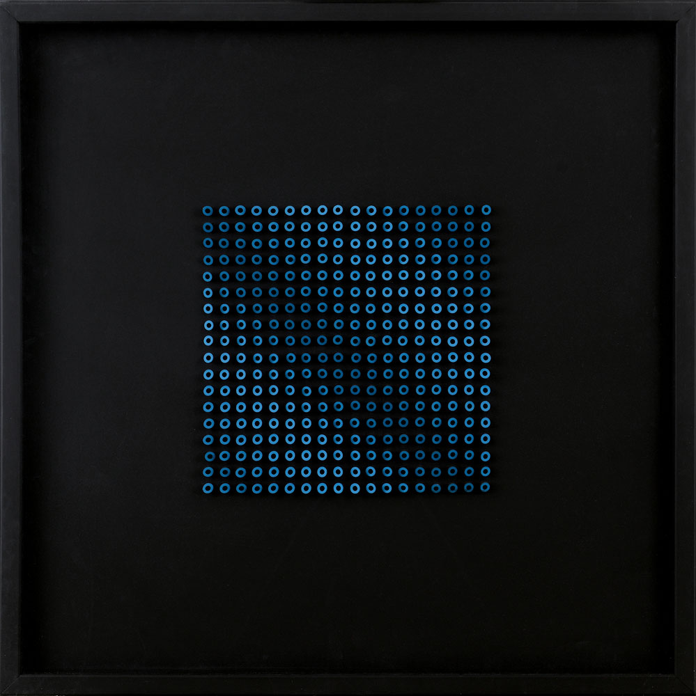 gradienti di luminosità, cilindretti plastici su pannello in plastica cm. 80x80, firma e titolo incisi ed etichette dello Studio F.22 (Palazzolo sull'Oglio-BS) e della Galleria Il Delfino (MI) al retro, fotografia allegata ritraente l'artista con l'opera, entro teca in plexiglass.