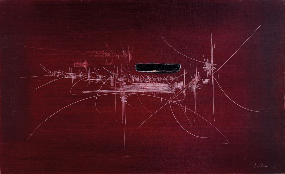 olio su tela cm. 54,5x90,5; firma e anno in basso a destra, etichetta e timbri della Galleria Lagorio Arte Contemporanea e timbri del Centro Arte Internazionale (MI) al retro, dichiarazione d'autenticità a cura di Laurence Izern, Galerie Protee (Paris) su foto.